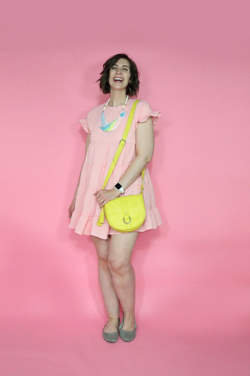 And in the very last outfit, I’m wearing a pink mini dress that I scored on Poshmark. It’s identical to the polka dot dress from my last thrift haul. Hey, when you like something, why not buy doubles?