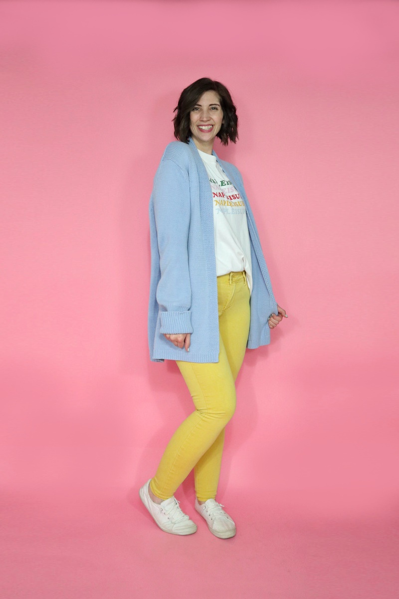[irp]The third outfit has a new-to-me baby blue cardigan. I was totally smitten by the color! Just imagine the outfit possibilities!