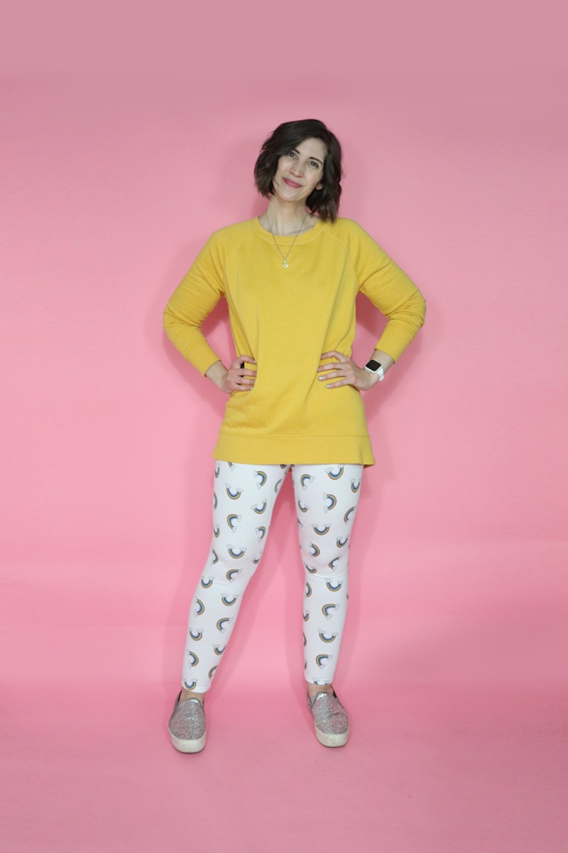 Then can we talk about this sweatshirt? TBH, I’ve got like 3 yellow sweatshirts now so I don’t need anymore but this longer length one was too good to pass up. I picked up the rainbow leggings for fun from a community closet!