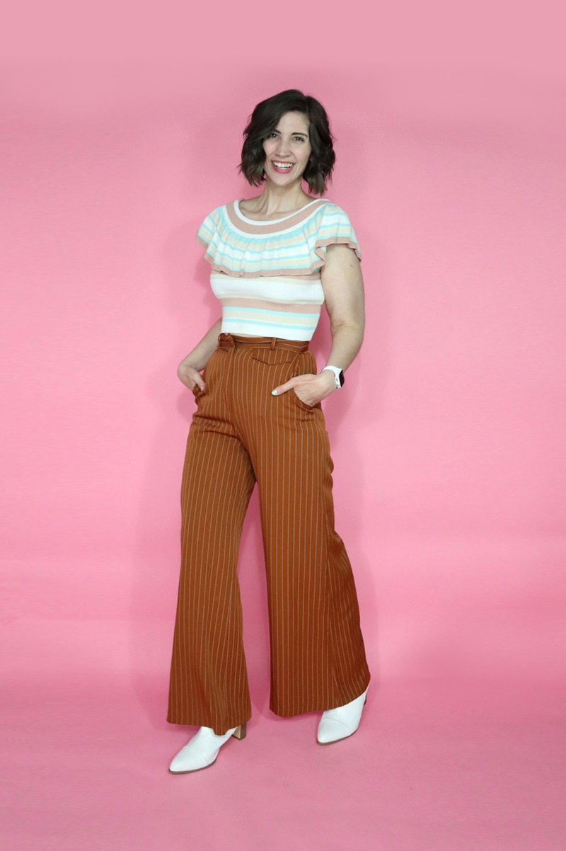 From this row of photos, I thrifted the flouncy striped crop top that I paired with these rusty orange-y palazzo pants that I previously bought from thredUP.