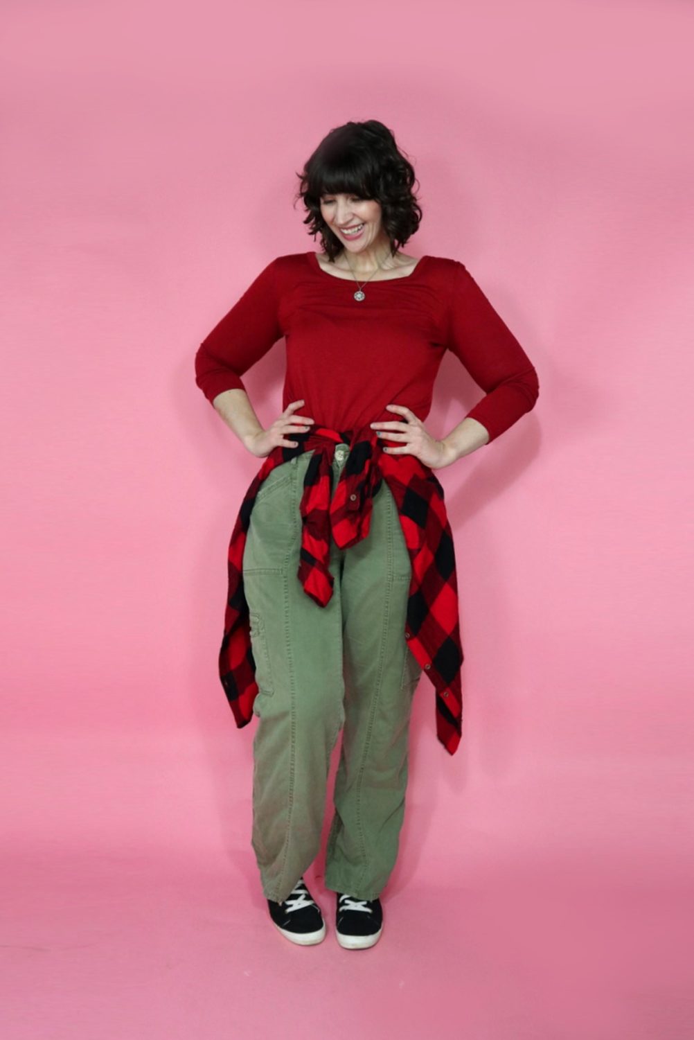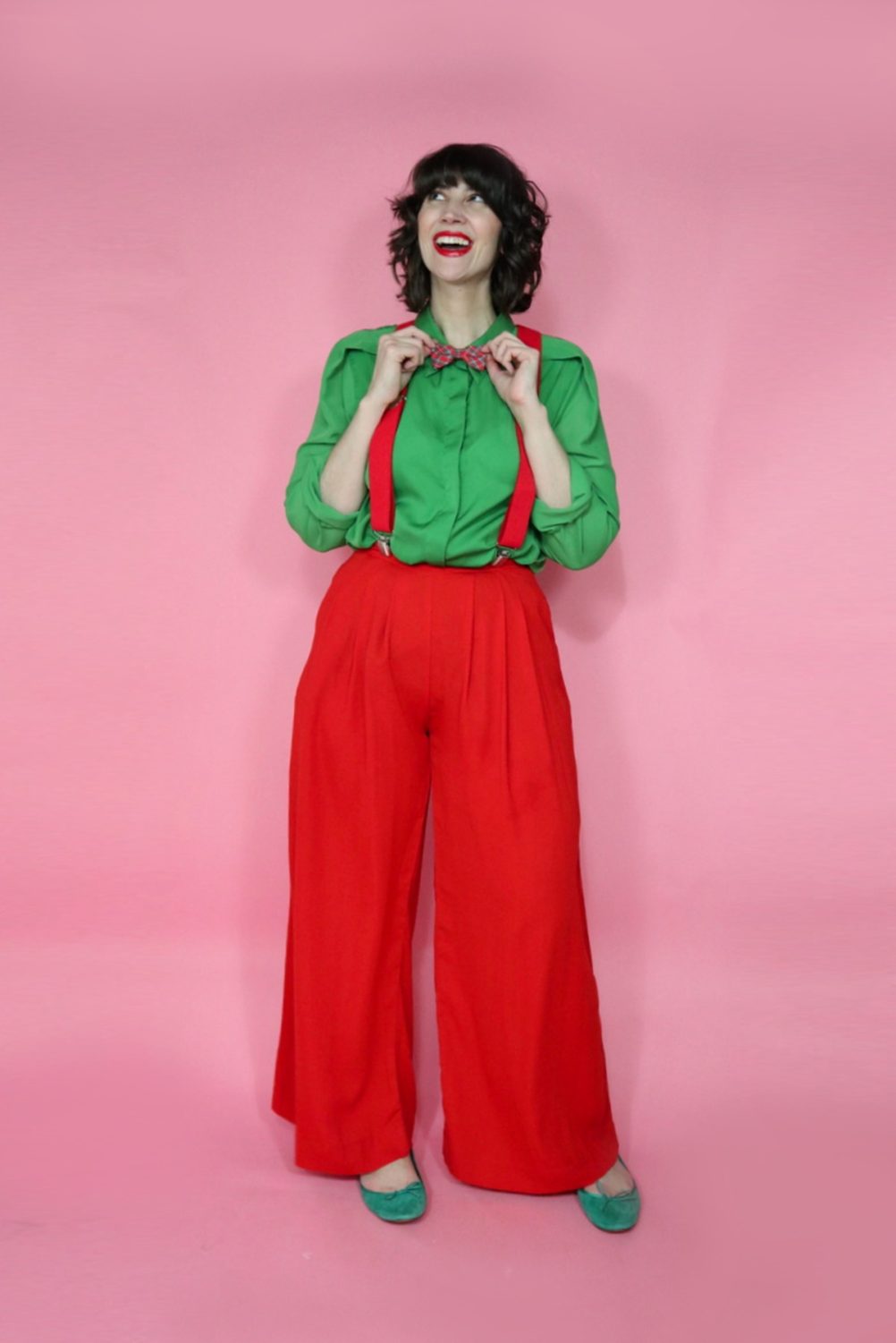 Pair a festive top with some cozy pants but keep the whole look in red & green Christmas colors. Remember: comfort and festive are not mutually exclusive!
