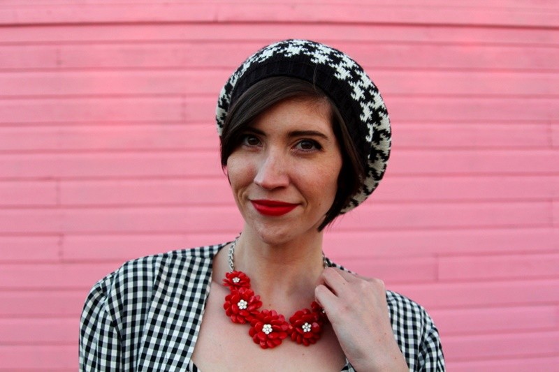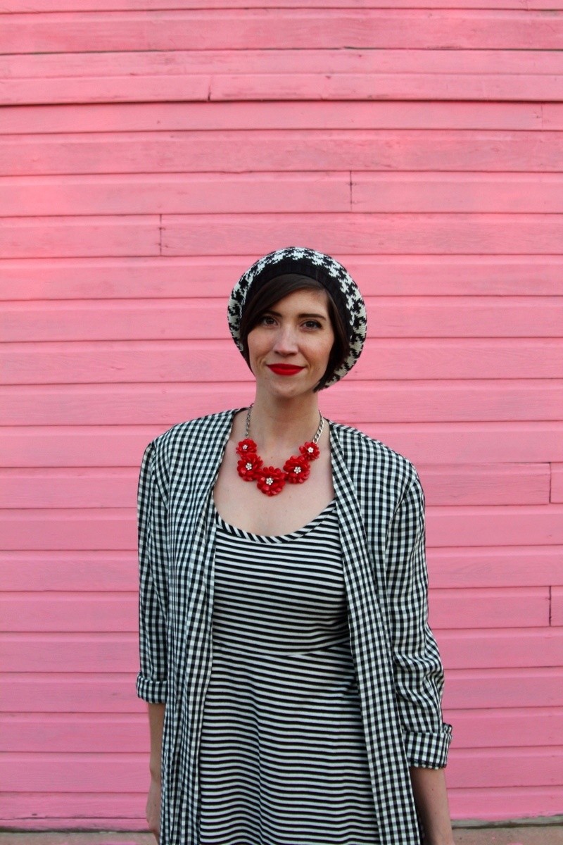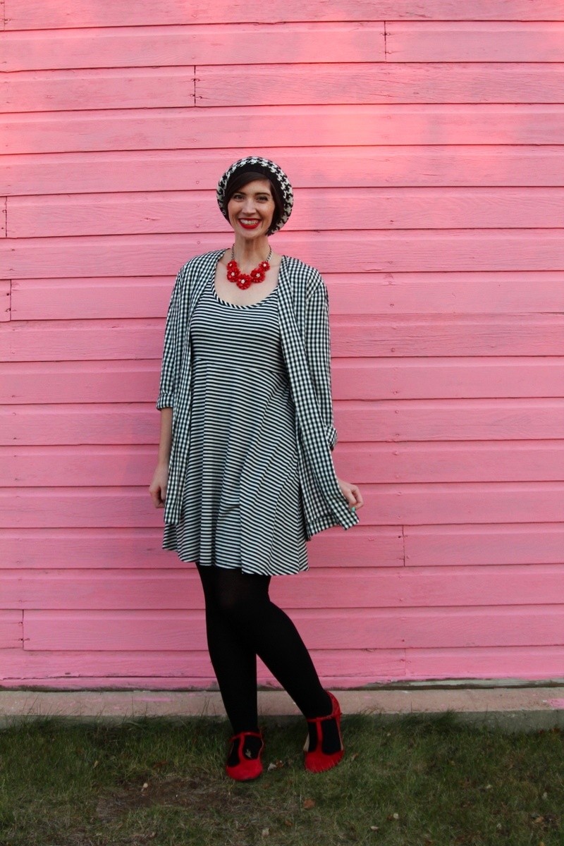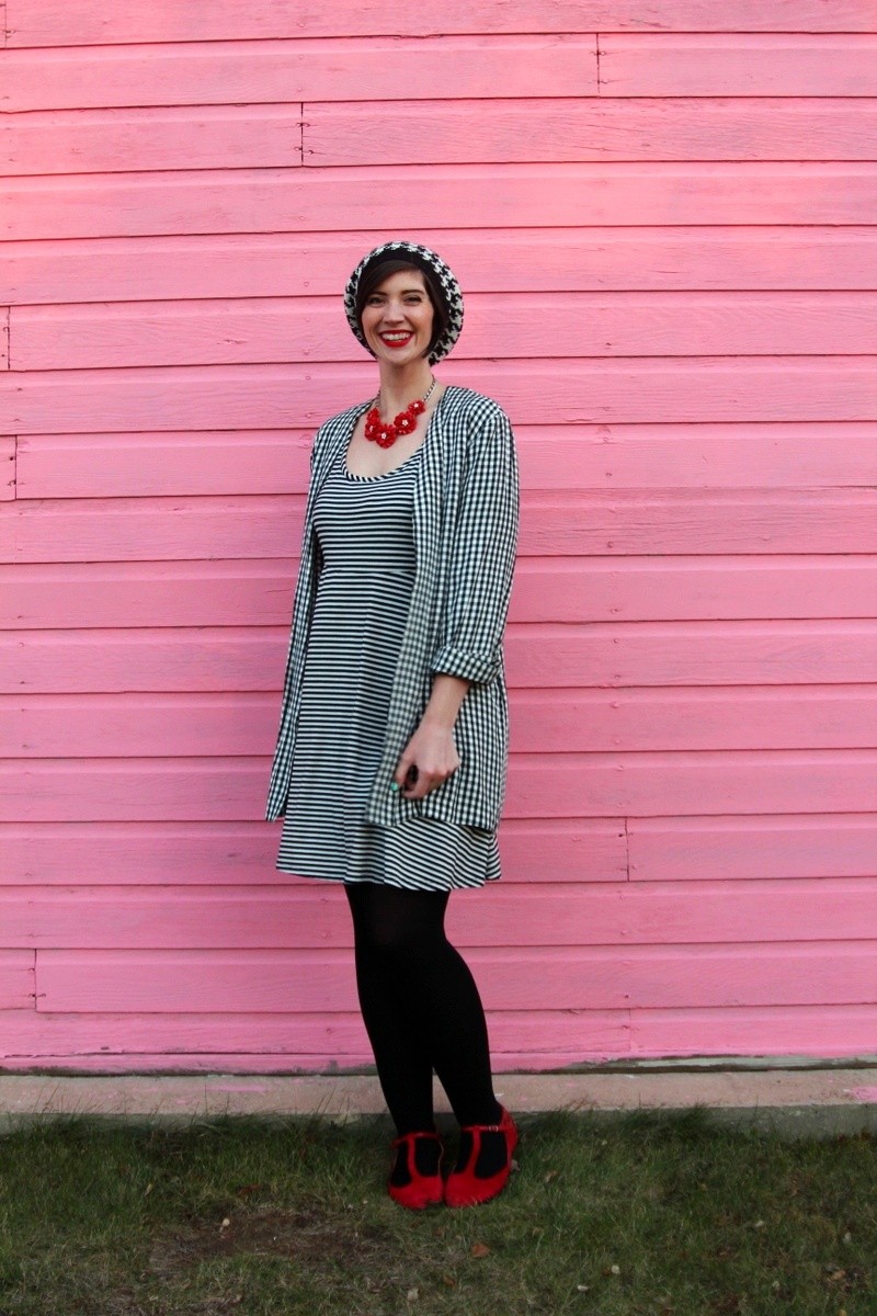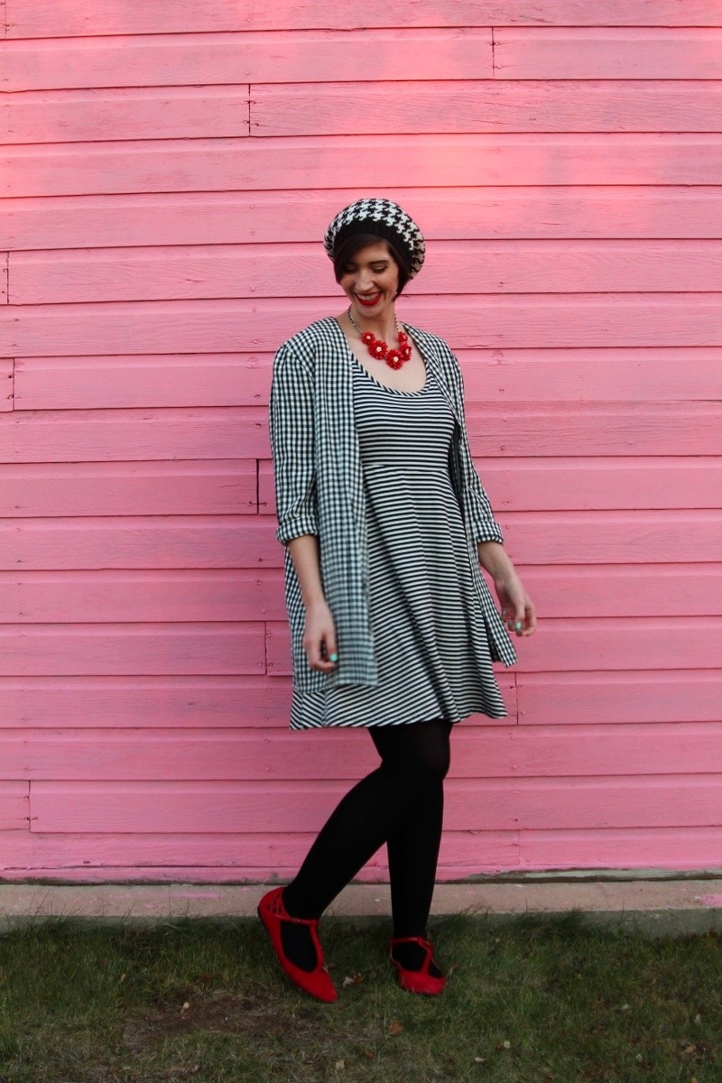 I begrudgingly wore it for this outfit but it wouldn’t be my first choice (did he forget about my sweet pork pie hat?) and I’m not sure I like how much it clashes with the other black and white pieces. Oh well!