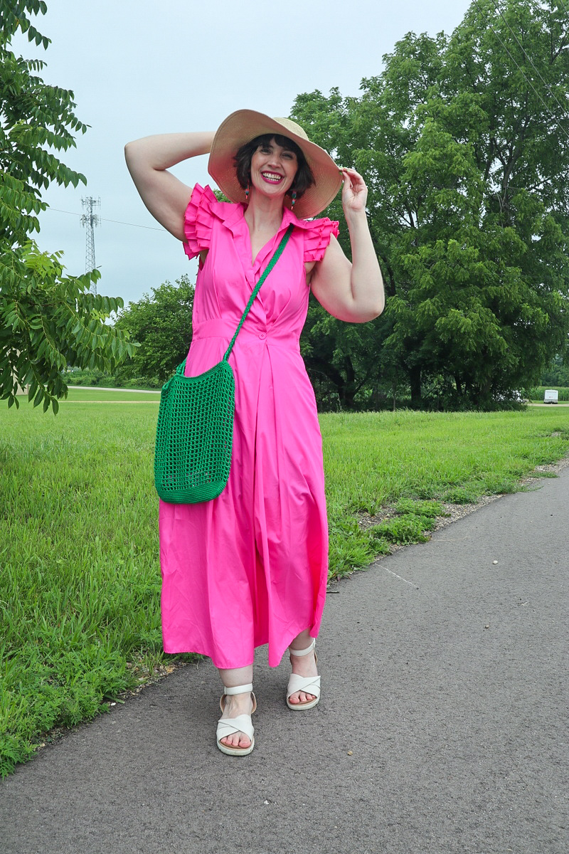 I saved the best for last-this stunning Barbie pink maxi dress I thrifted last summer! It just screamed to be styled for an adventure and, while I didn’t go outside my hometown this summer, this was a stunner to dress up for a regular day in my life.