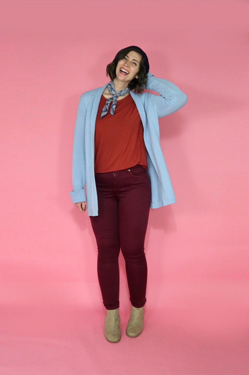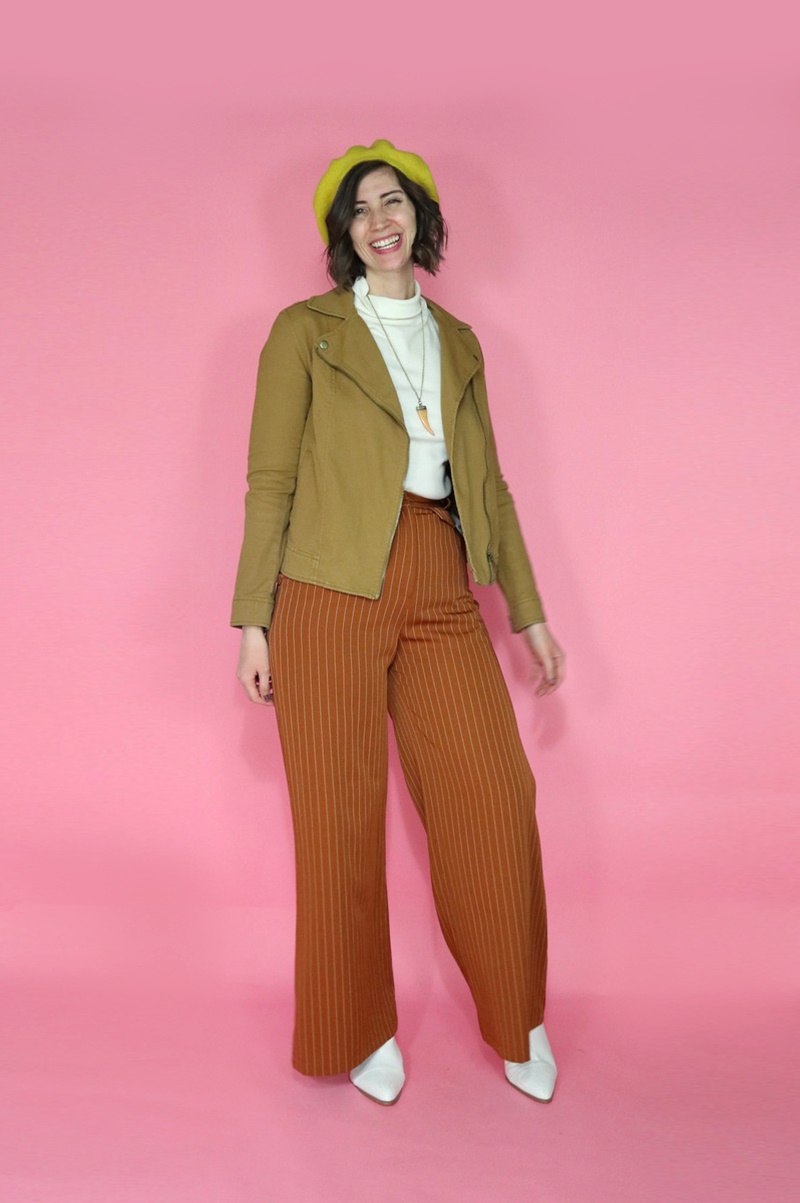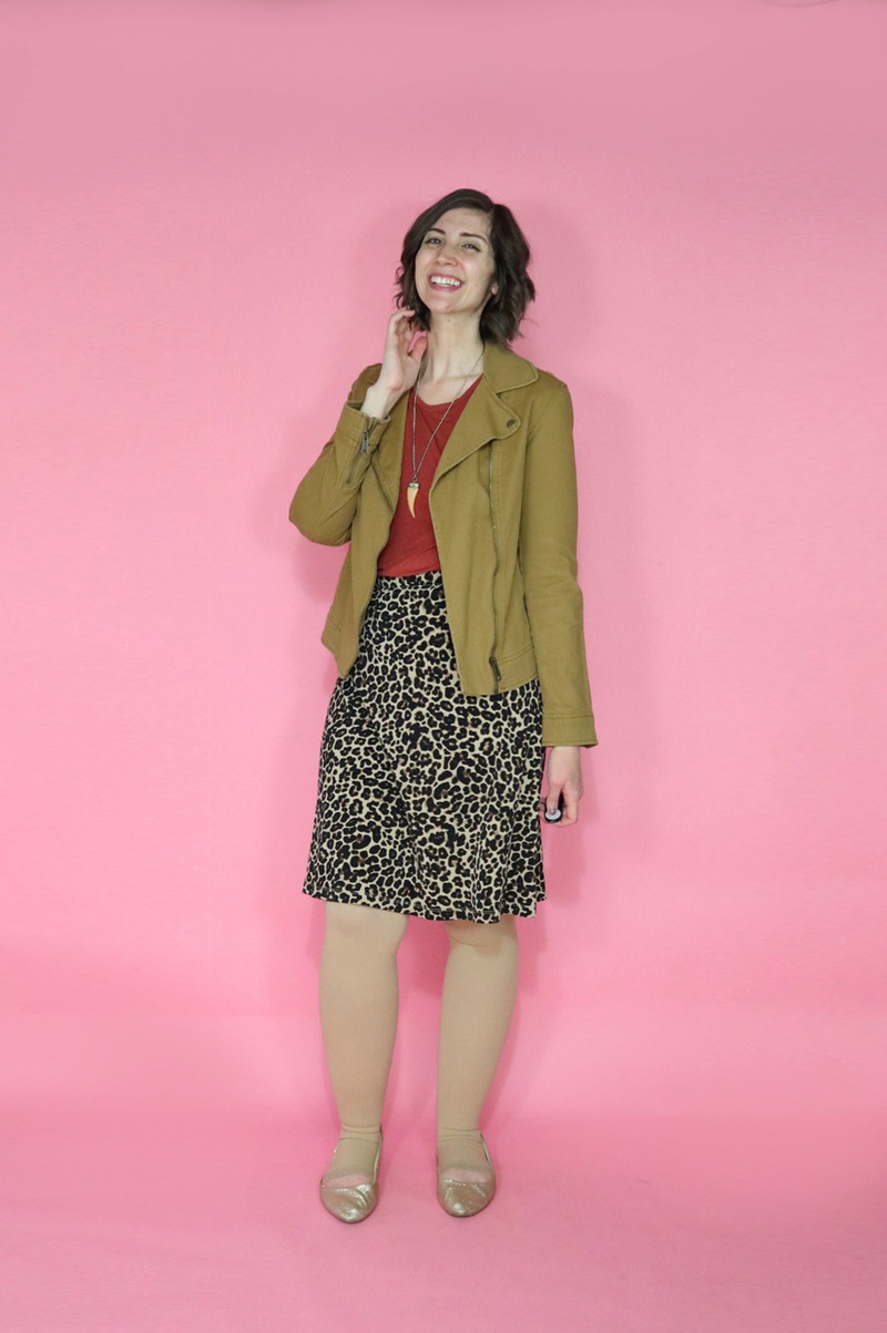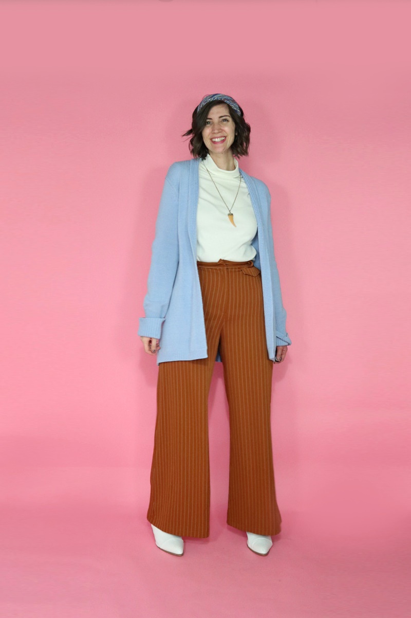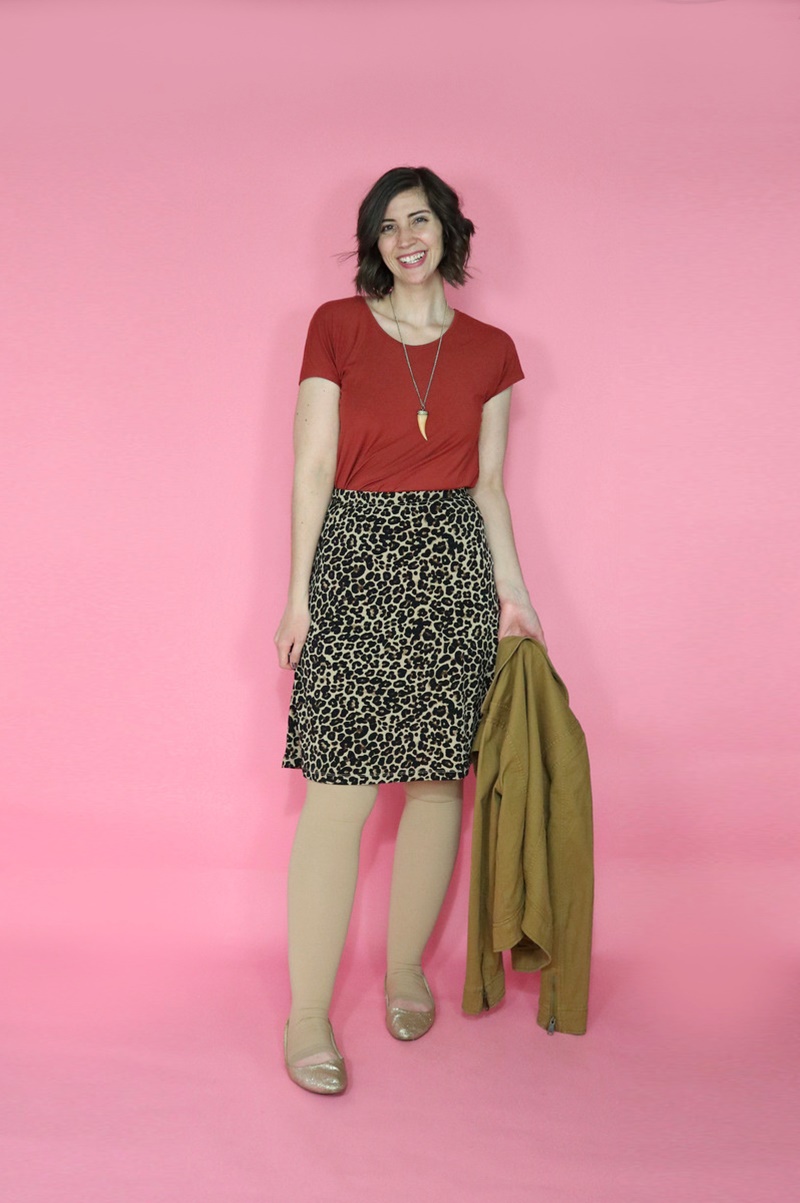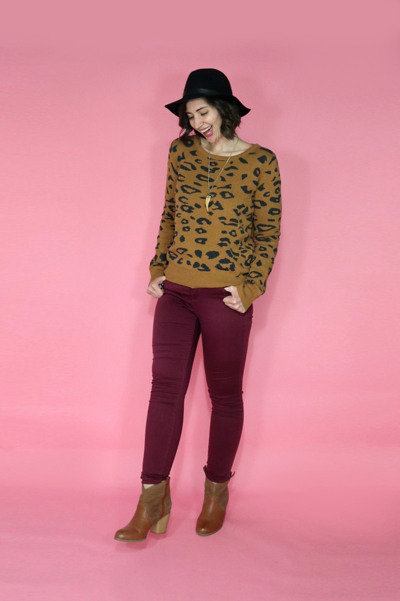 They are: little orange dress, orange tee, yellow tee, white turtleneck, leopard print pullover sweater, baby blue cardigan, cognac moto jacket, maroon jeggings, leopard print skirt, and burnt orange palazzo pants. (If I did it all over again, I’d swap out the orange tee for a graphic tee. I think it would have expressed my personal style a smidge better.)