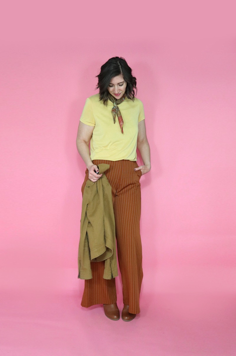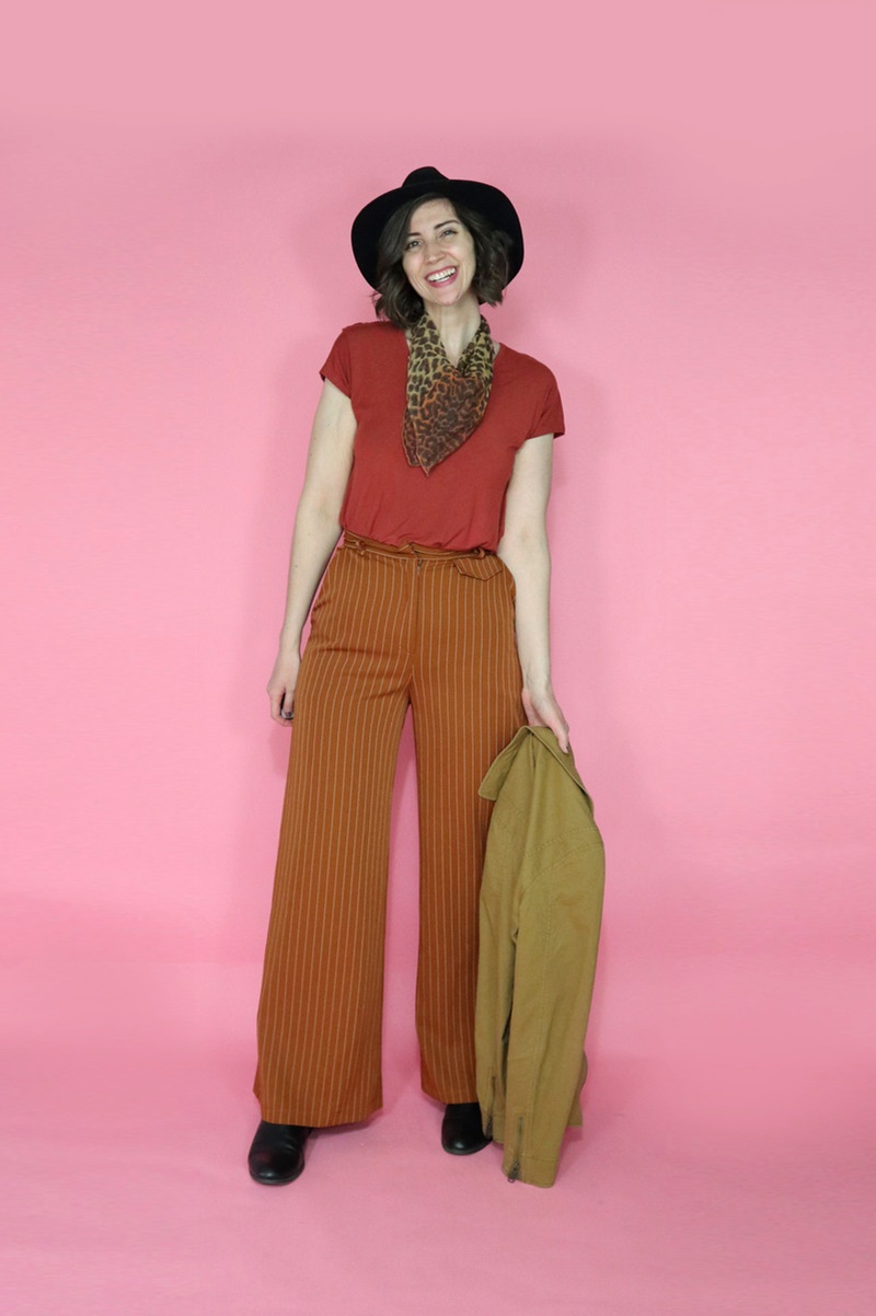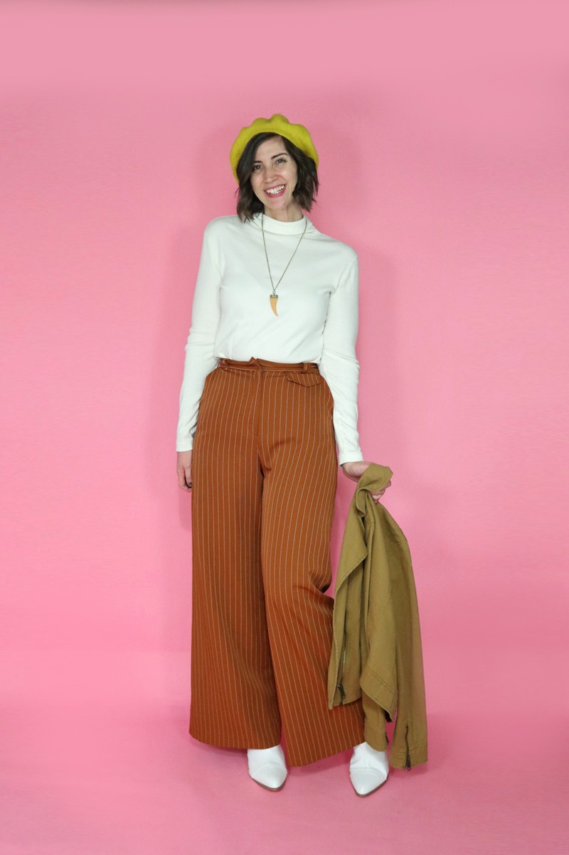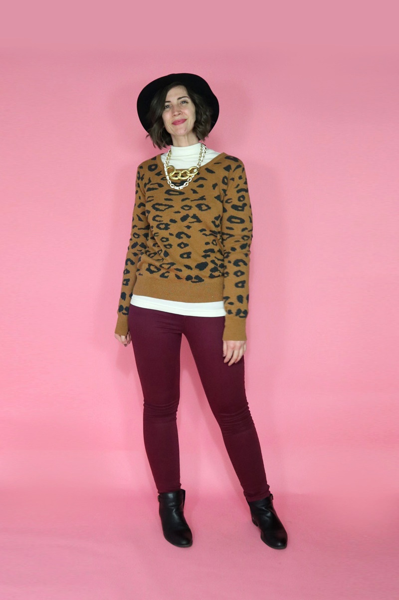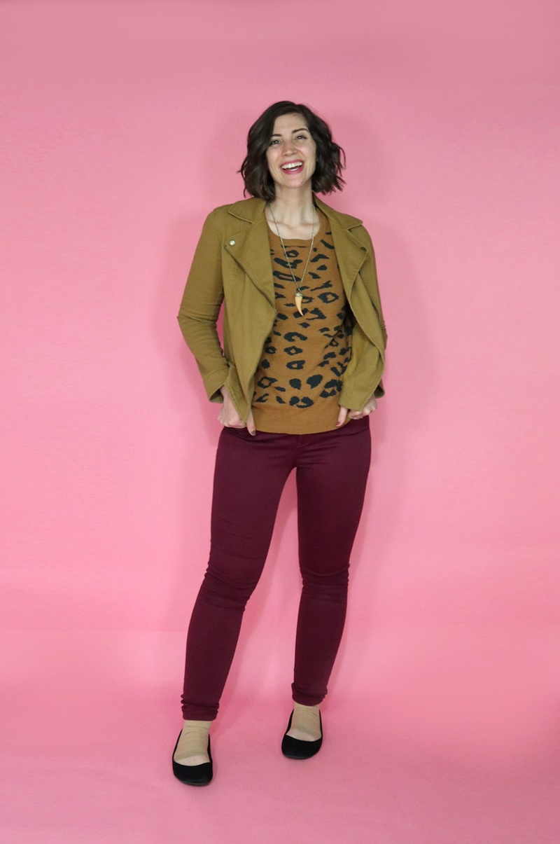 They are: little orange dress, orange tee, yellow tee, white turtleneck, leopard print pullover sweater, baby blue cardigan, cognac moto jacket, maroon jeggings, leopard print skirt, and burnt orange palazzo pants. (If I did it all over again, I’d swap out the orange tee for a graphic tee. I think it would have expressed my personal style a smidge better.)
