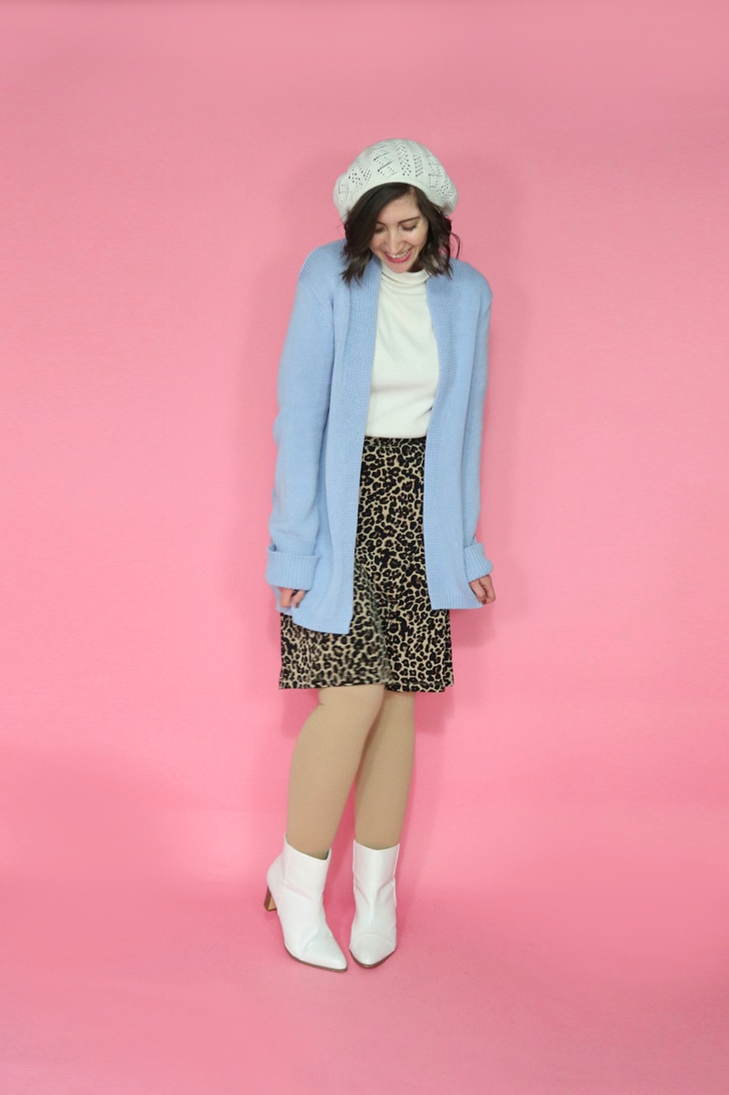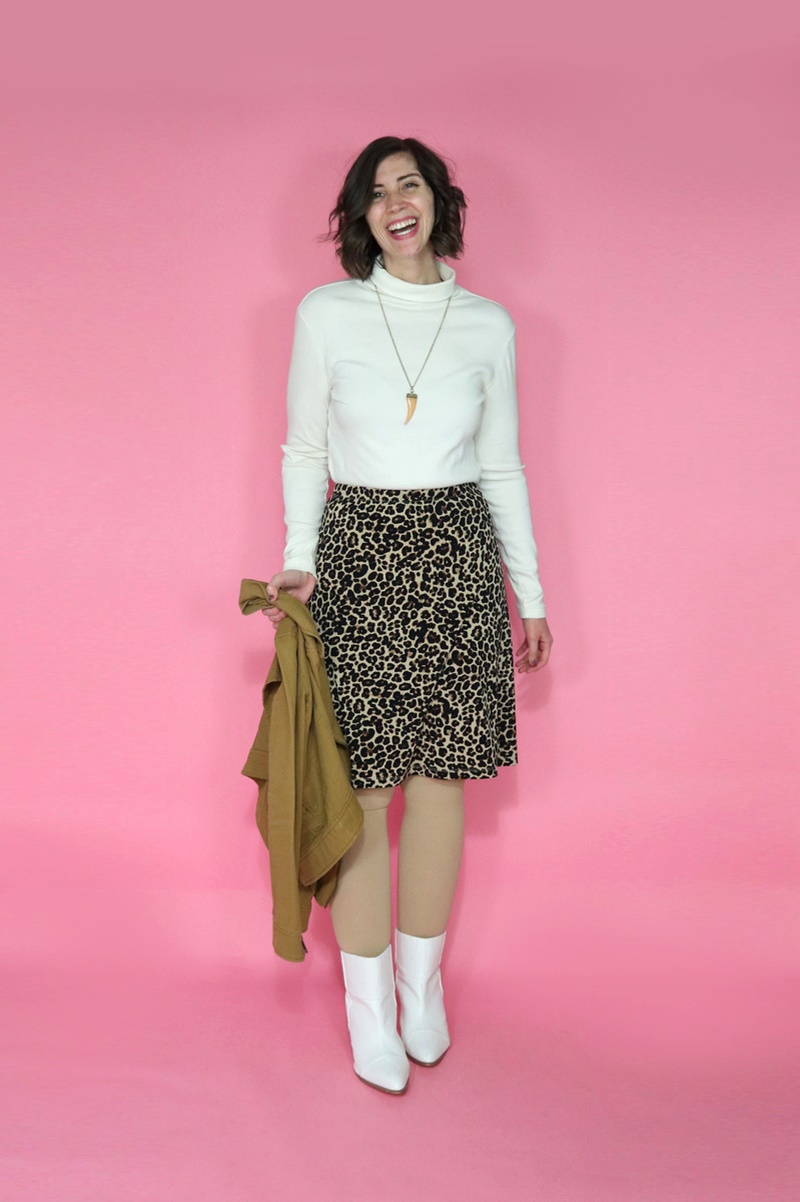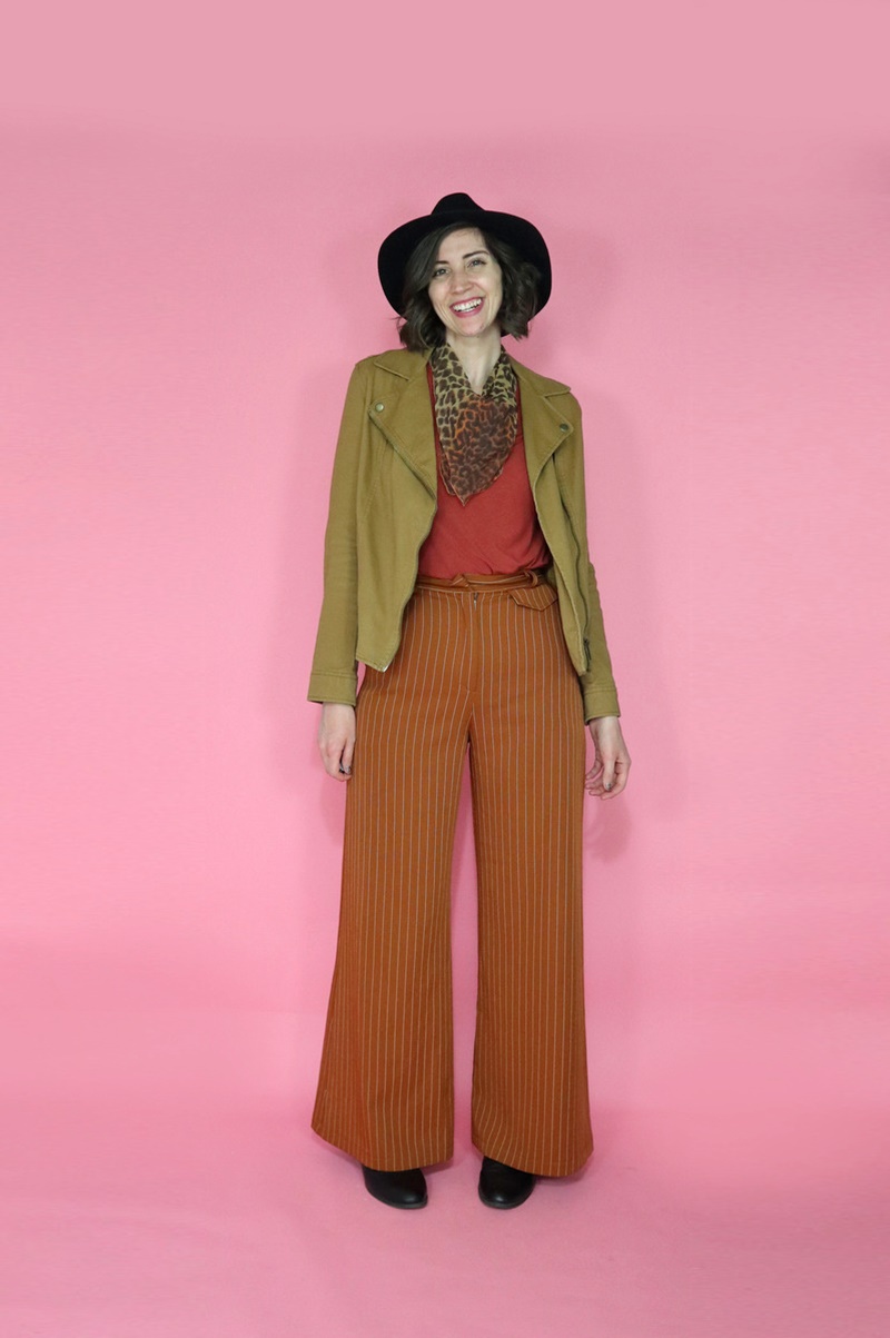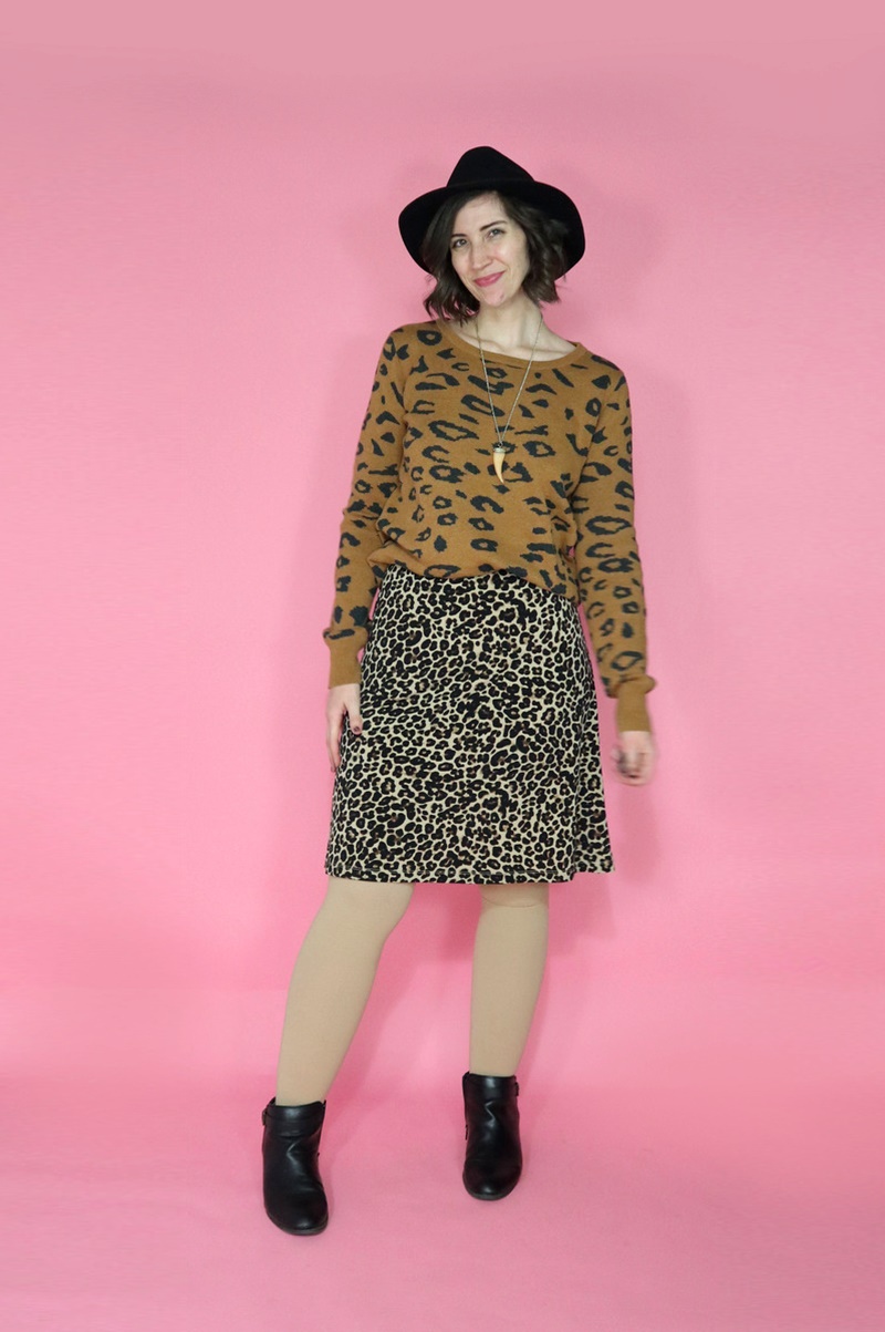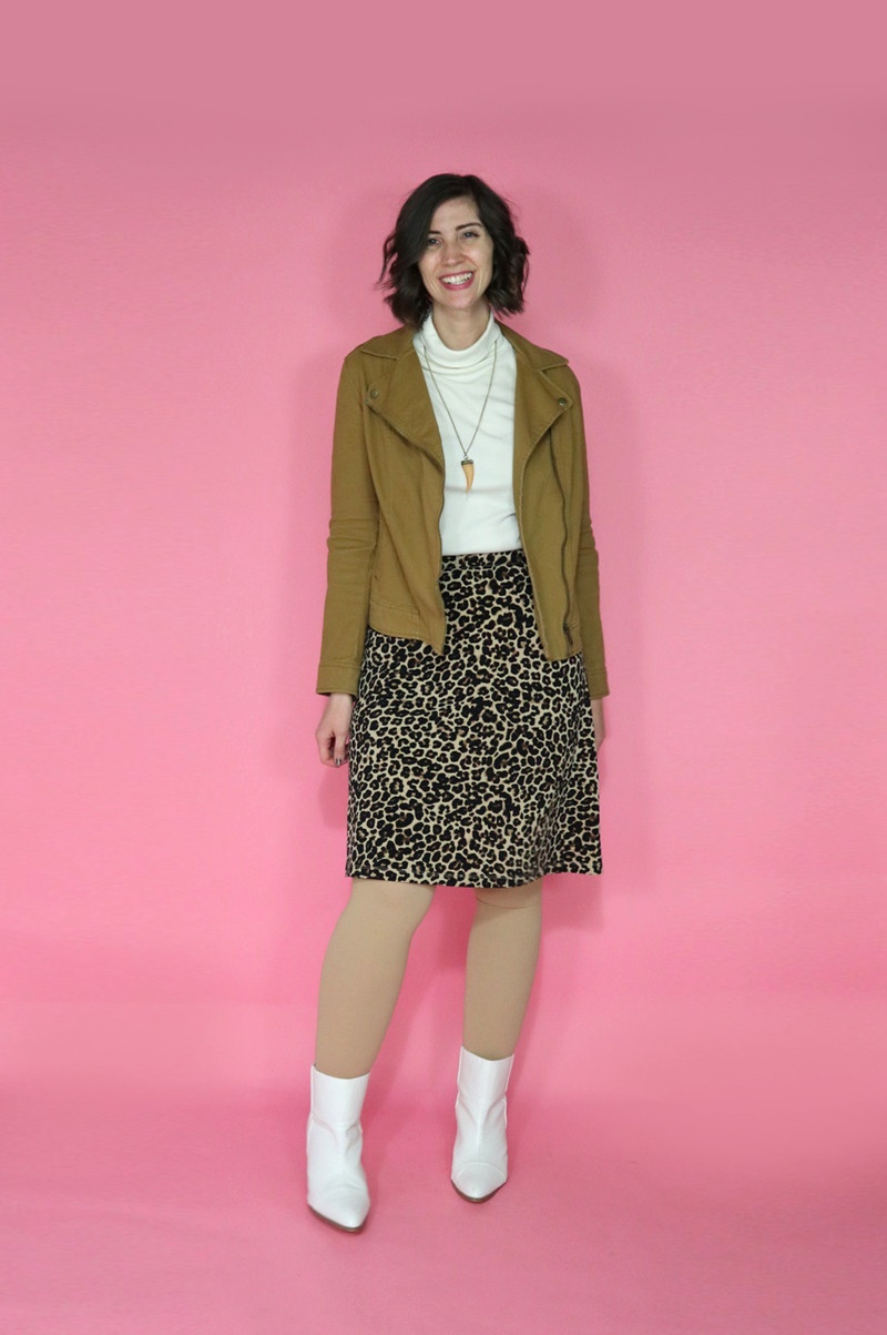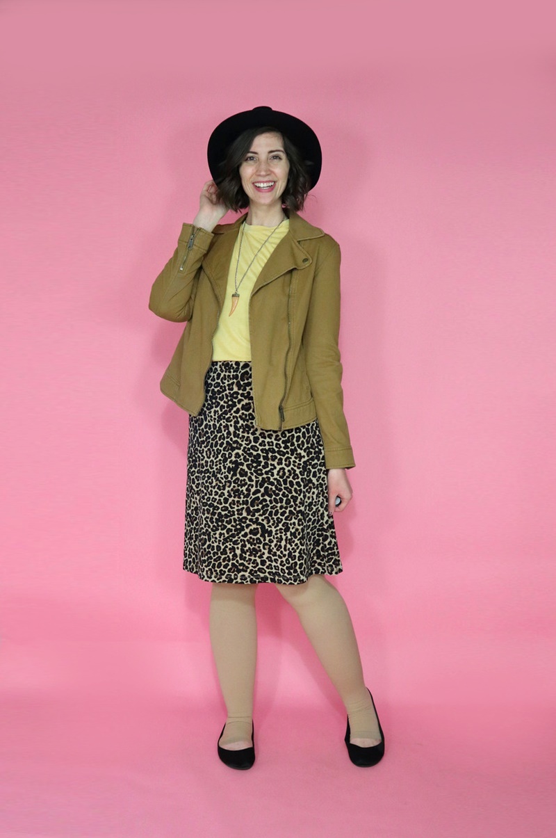 They are: little orange dress, orange tee, yellow tee, white turtleneck, leopard print pullover sweater, baby blue cardigan, cognac moto jacket, maroon jeggings, leopard print skirt, and burnt orange palazzo pants. (If I did it all over again, I’d swap out the orange tee for a graphic tee. I think it would have expressed my personal style a smidge better.)