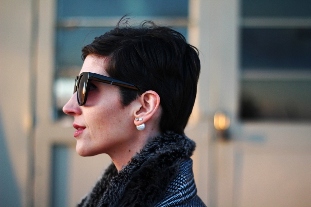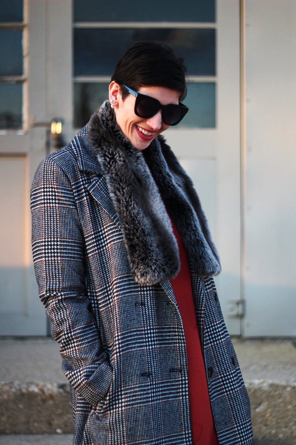 Thrifted dress, fur collar, and sunglasses, $5 total