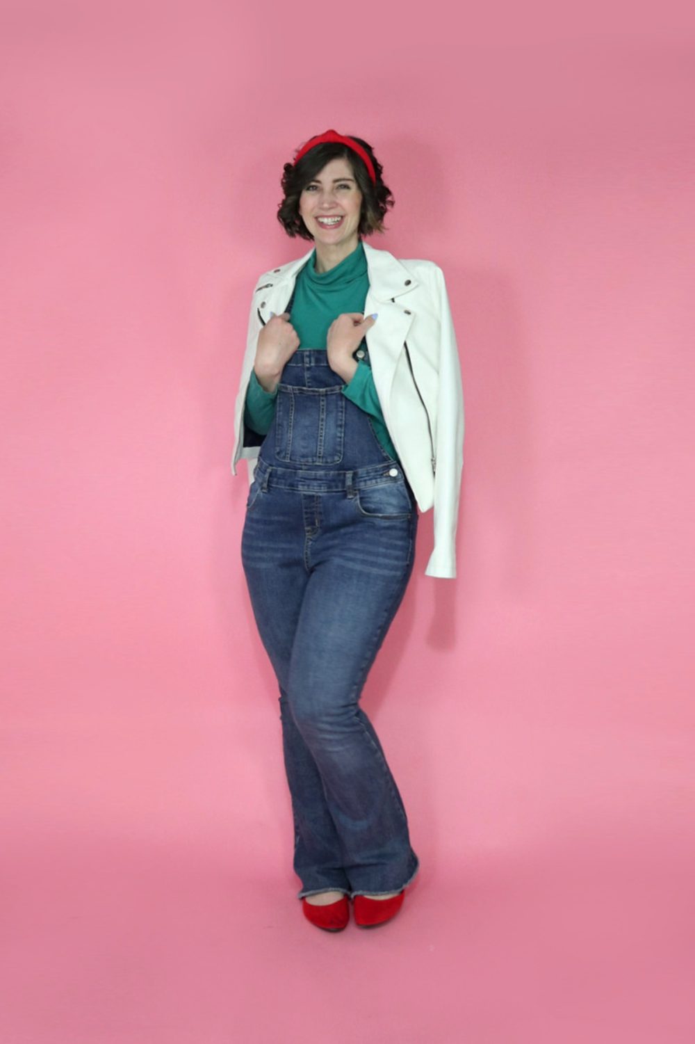 A quick way to toughen up any outfit, not just one with denim overalls, is to add a moto jacket. This adds an edge that helps balance out the youthful association of the overalls.