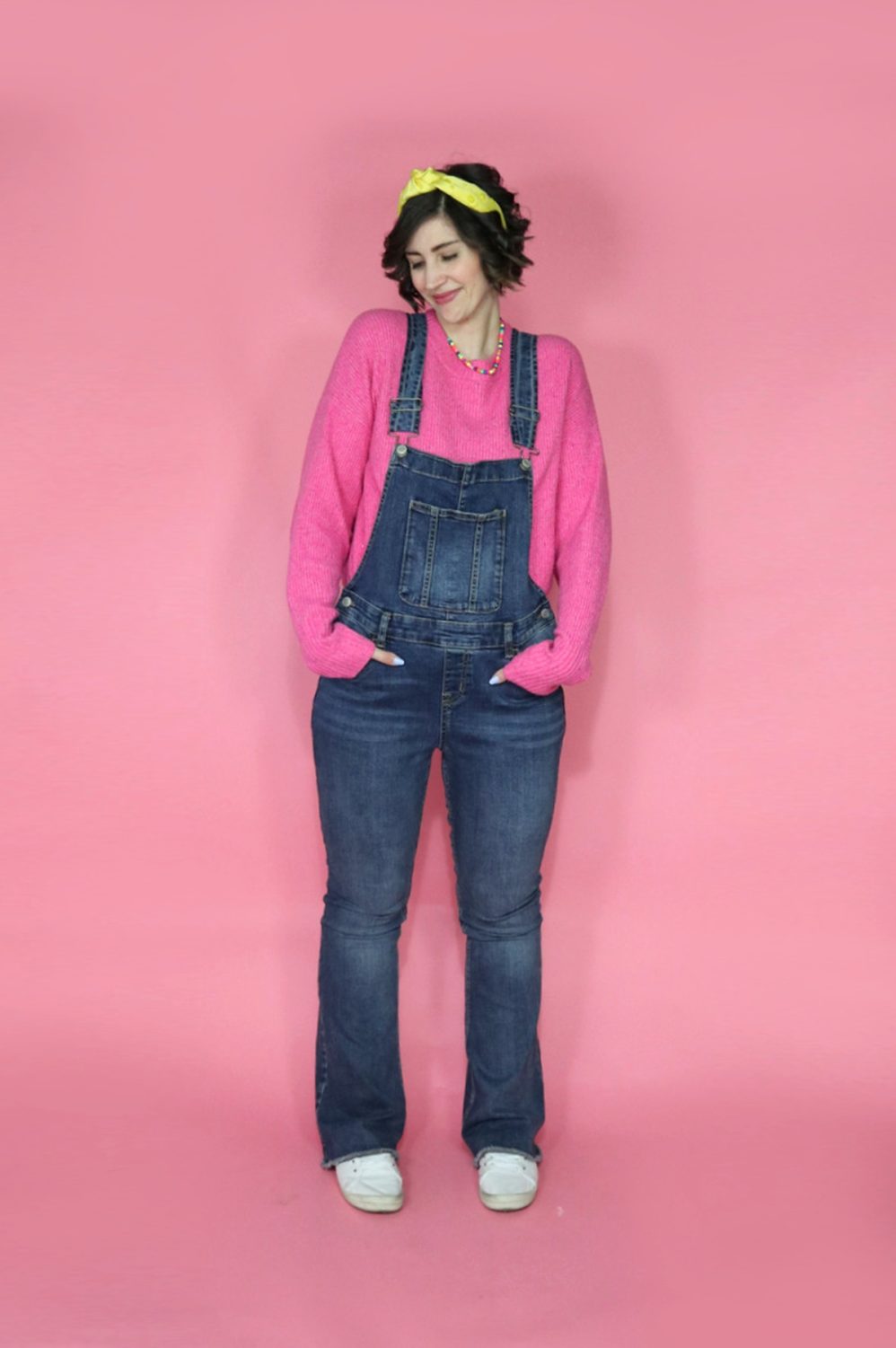 hannah is smiling in front of a pink background. she's wearing a yellow graphic tee, long brown cardigan, and flare denim overalls