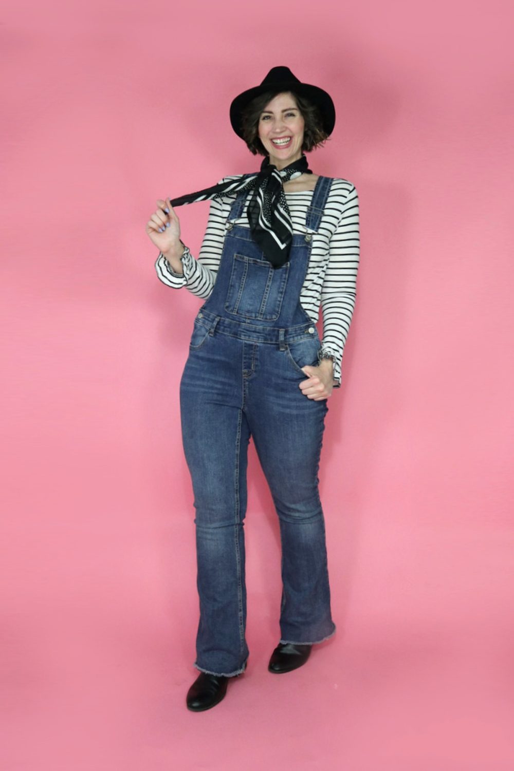 There are no rules when it comes to wearing flared denim overalls so have fun and experiment with different tops. I love the juxtaposition of a ruffly top underneath or the contrast of a big fuzzy sweater.
