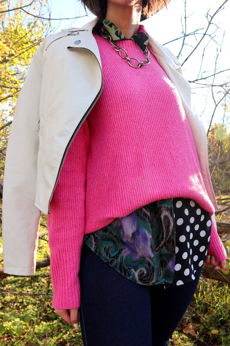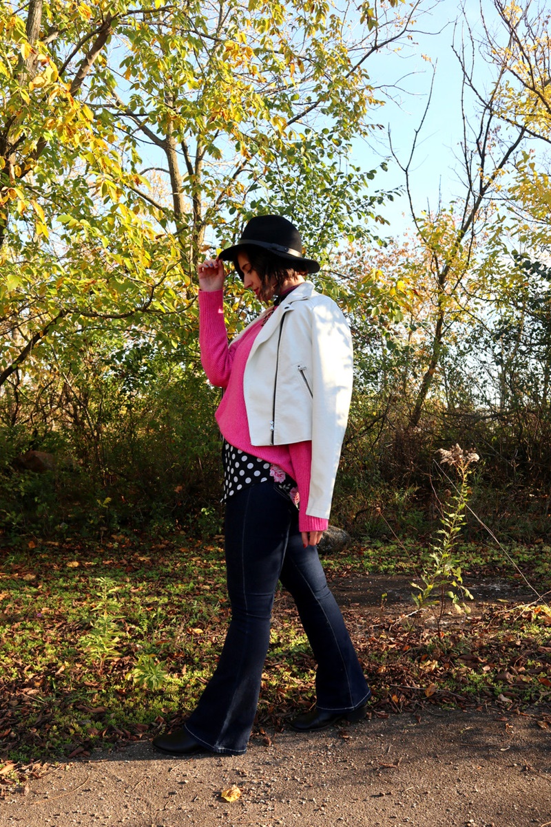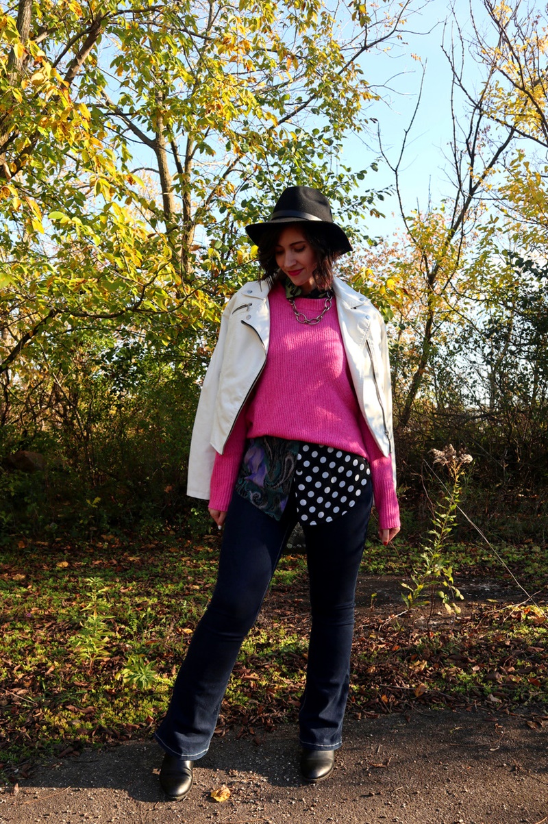 More than half of it was bought from thredUP, the largest online consignment store in the US. The white moto jacket is my newest purchase while the pink sweater and flared jeans were bought a year ago. I had a vision that they would play nicely with my wardrobe for a long time to come and I was right!