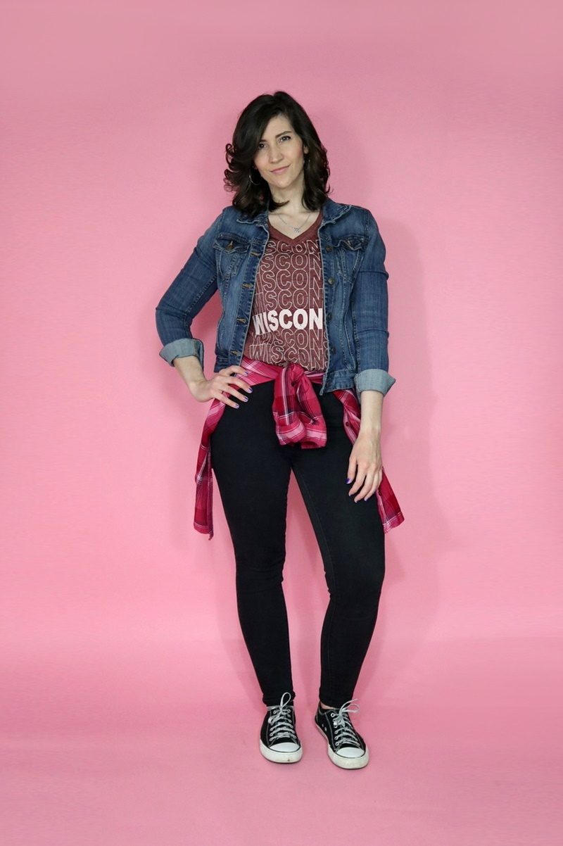 Maurices t-shirt | Thrifted jeans/jacket/plaid top, $7 total (buy similar jeans, buy similar jacket, buy similar plaid) | Walmart sneakers, $12 (buy similar sneakers)