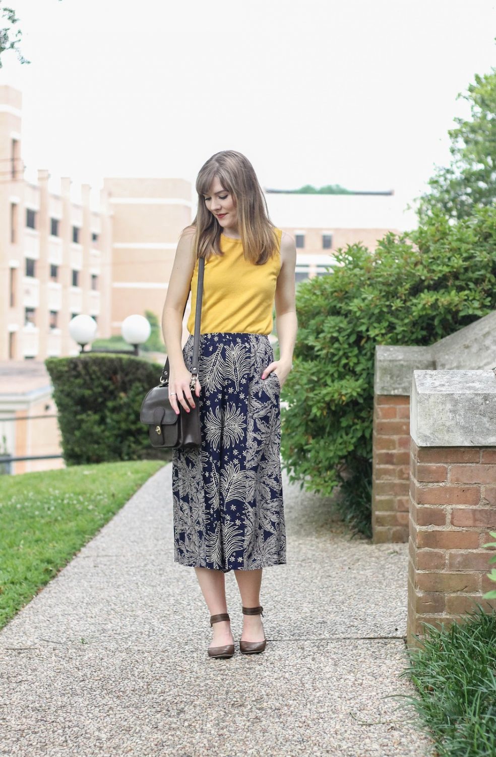 However, back to this unique spring look:) If you go and creep around on my blog you will quickly find that mustard is a color I love to wear on many occasions and get WAY to excited about! Therefore, when I was playing around with outfit combinations I knew that this mustard sweater top would pair perfectly with these culotte pants, bringing in a POP of color and golden sunny hues. To keep with the simple color palette, I finished off the look with this classic brown vintage coach purse that I picked up at the thrift store (there’s another perk of thrifting for you) and grabbed my brown ankle strap flats to compliment it. This is the first time that I have paired all of these pieces together for an ensemble, but I quite like how it turned out, and let me tell you that it was incredibly comfortable too (which is always a plus, when your clothes feel like pajamas)!