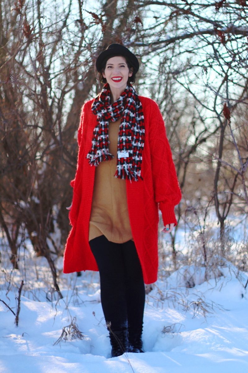A Long Layer + Long Layer – Seen here with a long sweater, long cardigan, and long scarf.