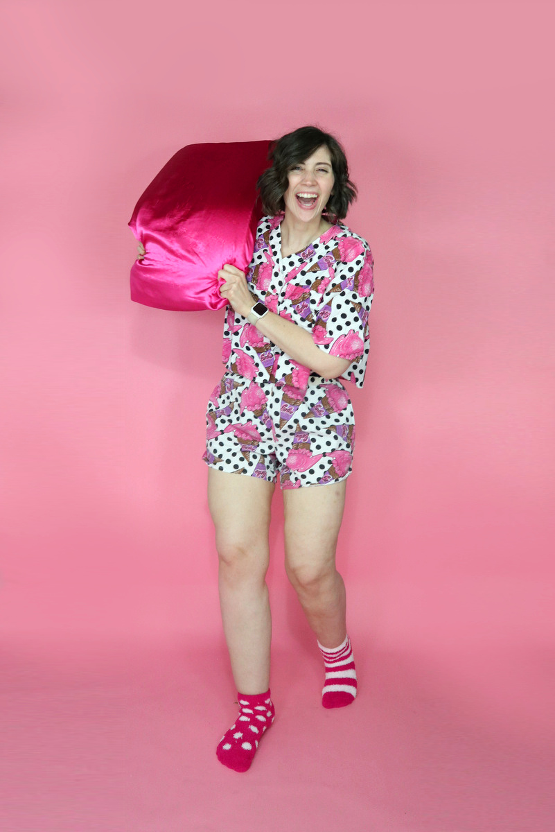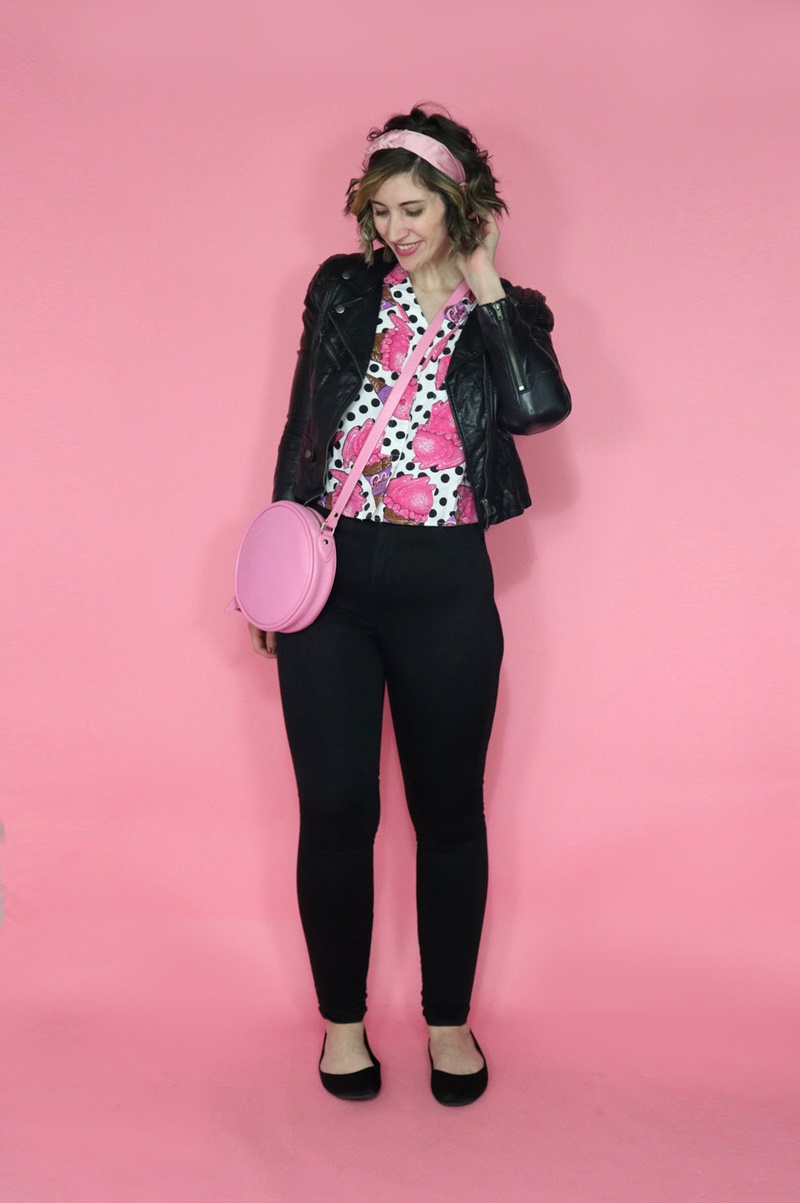 This ice-cream PJ set is vintage Esprit (!!!!) that I picked up during the luckiest 30th birthday thrifting trip EVER! It’s fun to sleep in but people need to see it! So a good friend of mine said I had to wear it as an everyday outfit so I re-styled it here with an all black ensemble with pops of pink.