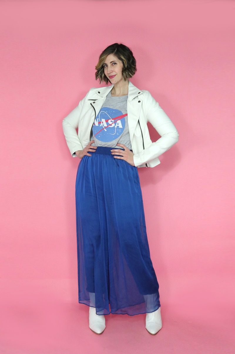 But back on Earth, in present day, I styled it with some blue palazzo pants and a stellar moto jacket. I think I’m better suited as an Earth girl!