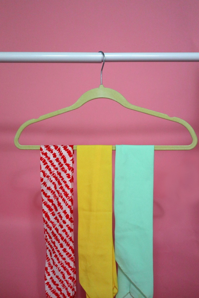 • Display tights. You can choose to fold tights over your hanger or tie a loose knot so they don’t slip off. See more of my tights collection and tips for wearing them in this post!