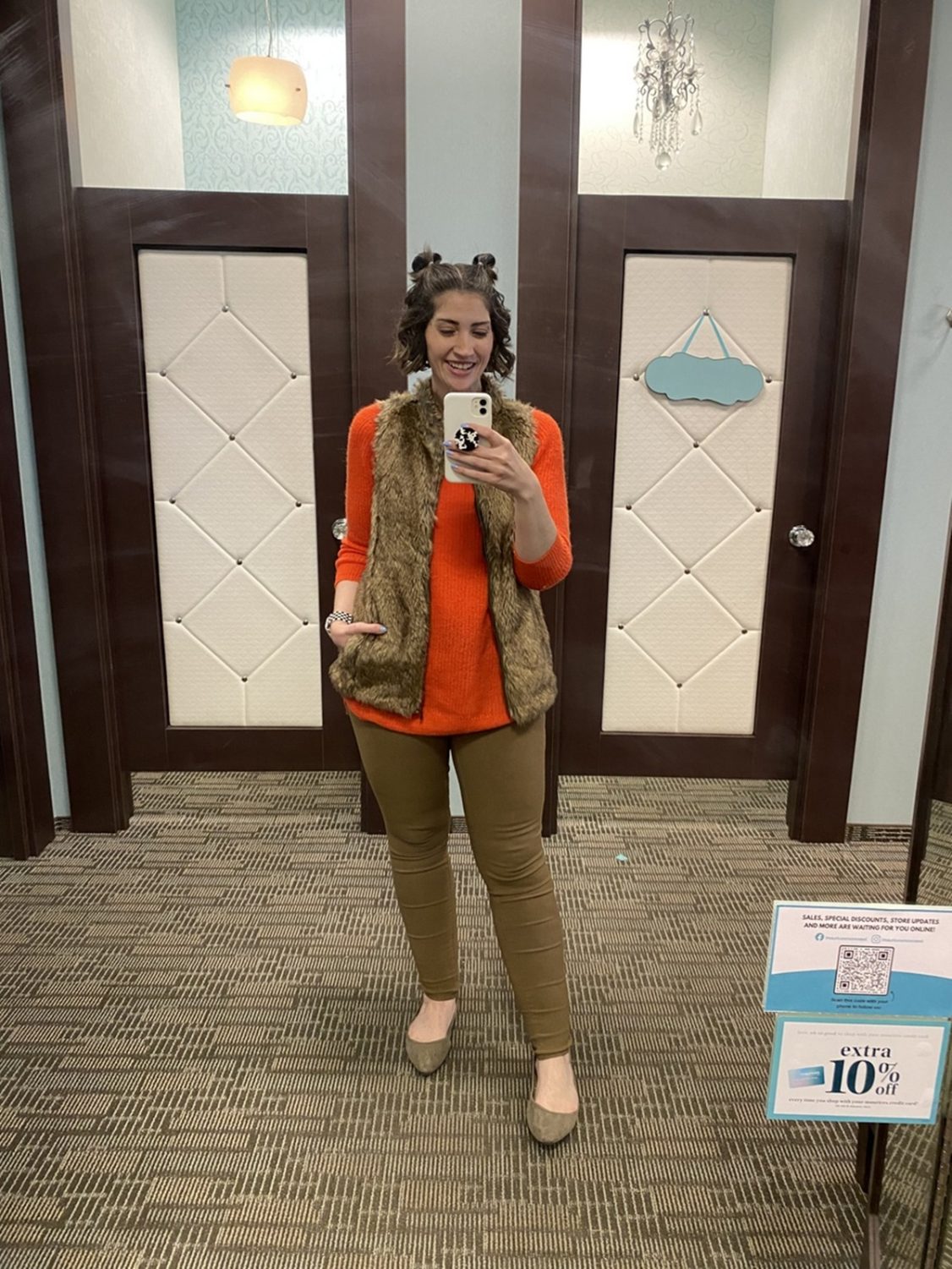 This outfit was worn for my second and last holiday floor shift. Our theme was “vest day ever” and I wanted to wear a puffer vest but don’t own one. My co-worker let me borrow hers and I think it helped pull it all together! All pieces are old Maurices, except the boots. The day was so crazy that I almost sold the jeans right off my body. LOL