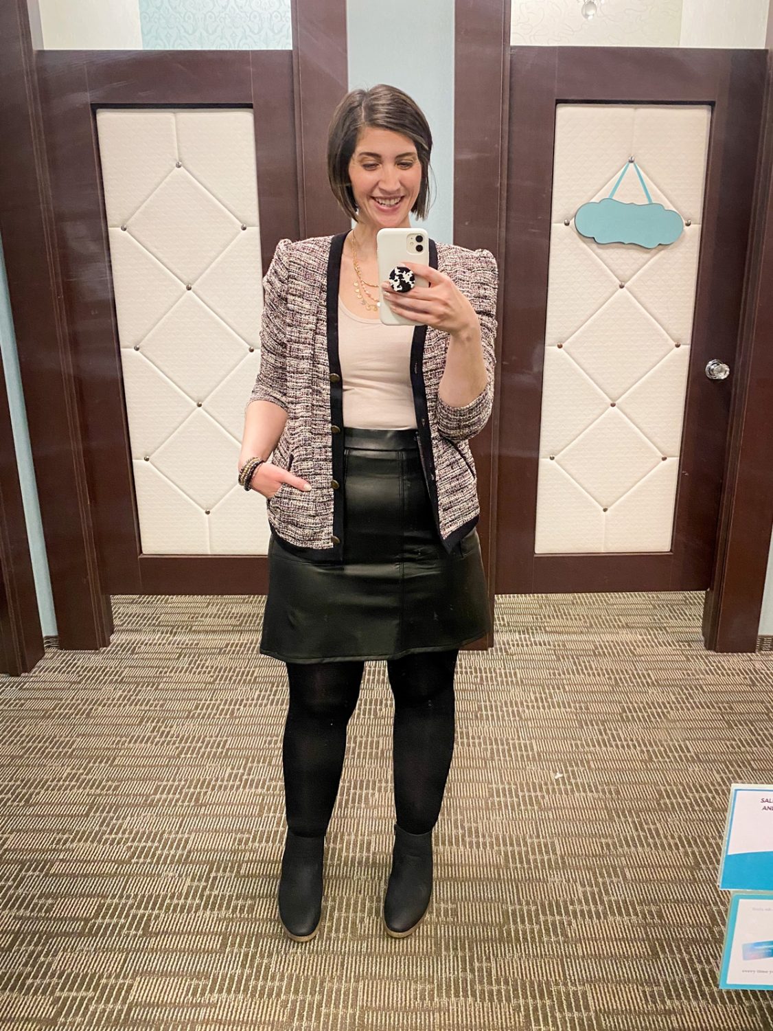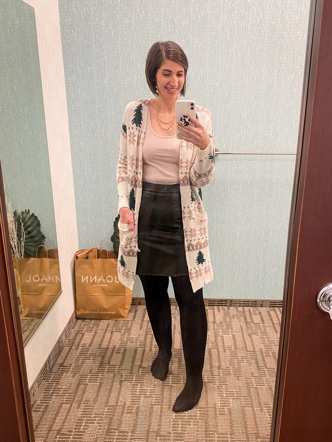 After trying on the cardigan look above, I had a few more new arrivals in the fitting room and decided to try them on. These aren’t outfits, per se, just having fun with some clothes! They look pretty good with this faux leather skirt… I think I need to add one to my closet!
