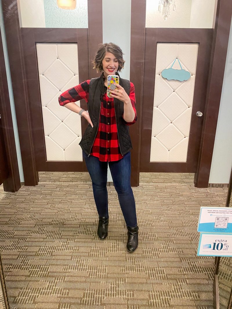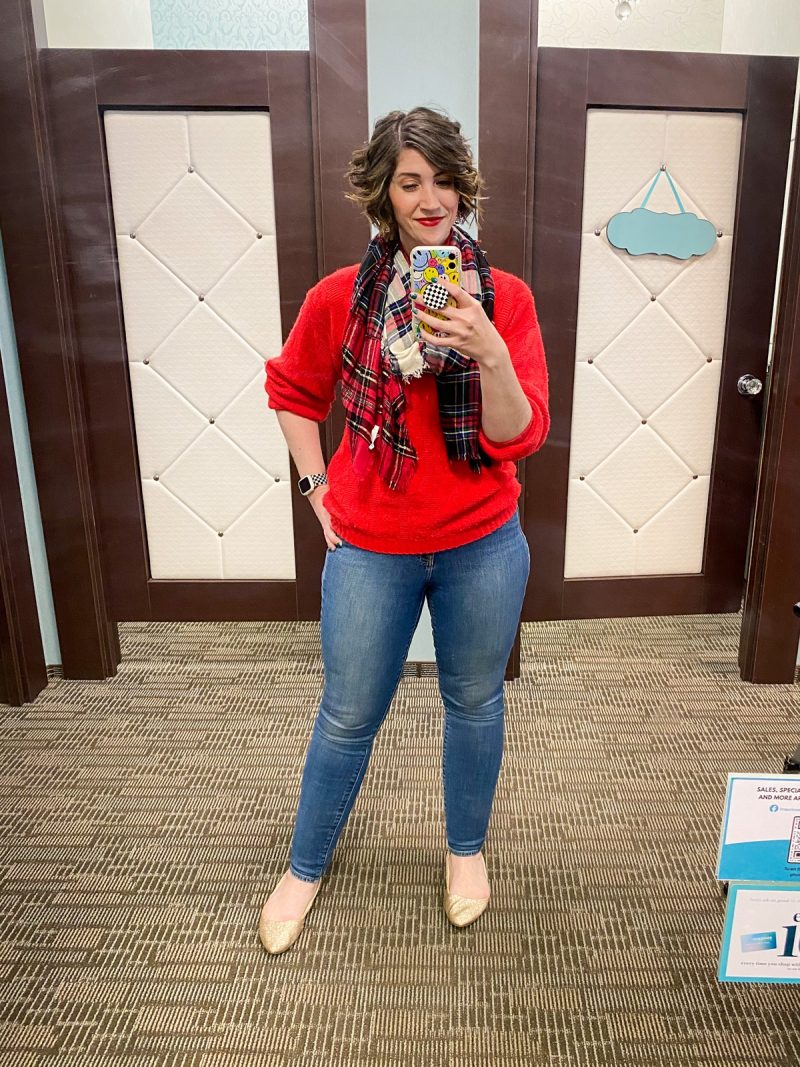 Maurices really hit the mark with holiday-themed clothing this year. Case in point: I styled up this super soft red fair isle sweater with a plaid vest, jeans, and a cream-colored hat. It’s so festive and fun! I feel like an extra in a Hallmark Christmas movie!