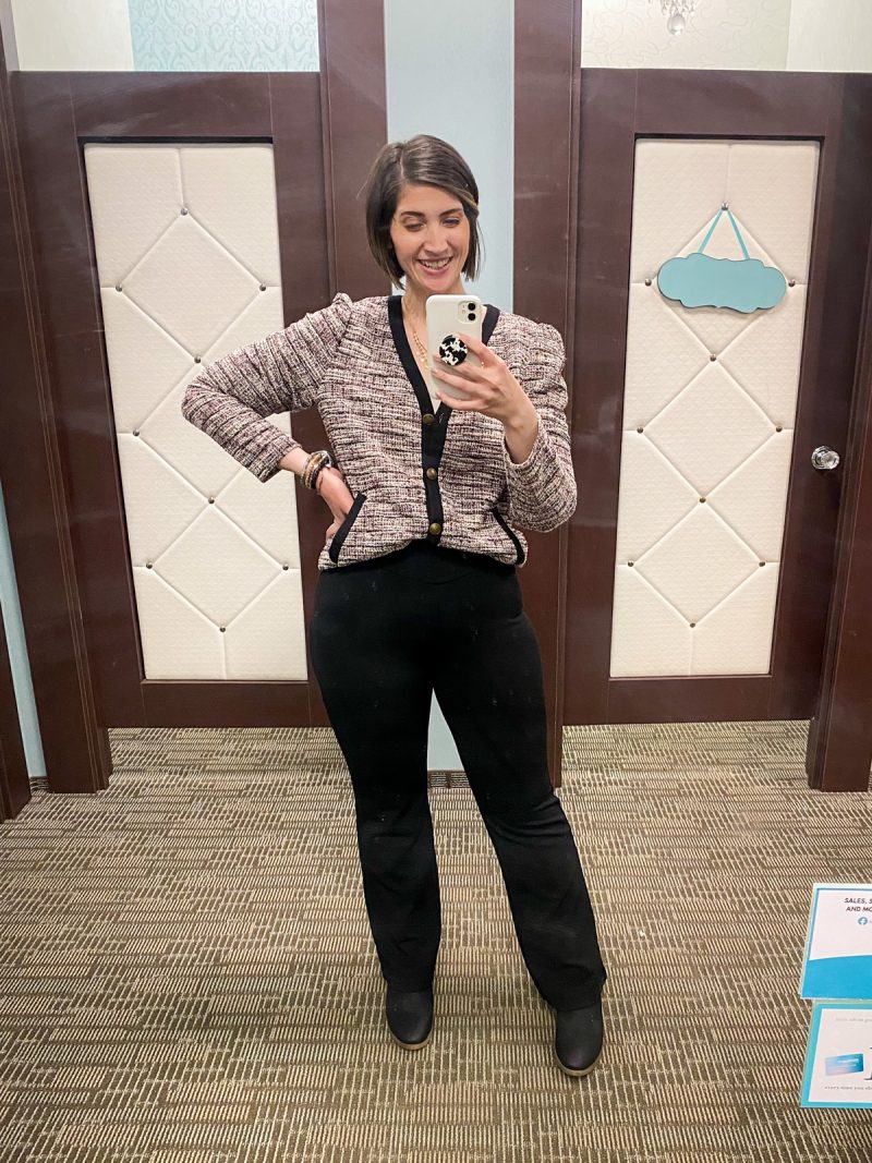 For these looks, I styled a tweed cardigan two different ways for a fashion challenge. Do you like it buttoned up or open? I’m leaning toward having it open!