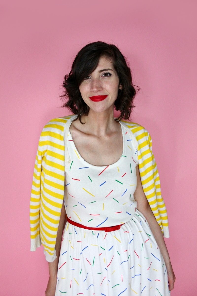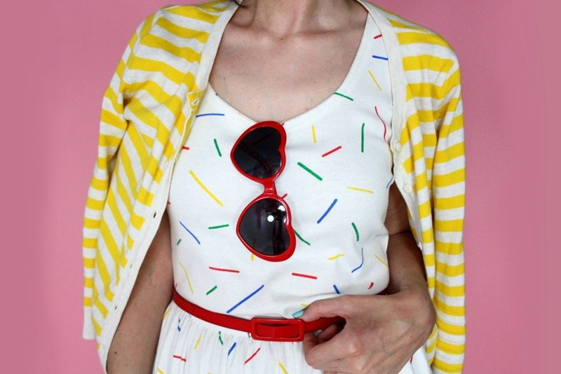 This 1980s dress didn’t need a lot of help since the whimsical pattern is quite timeless, as is the fact that it has pockets. I just added a few accessories to update it like these super fun red heart sunglasses, a red patent leather belt, and my favorite yellow striped cardigan.