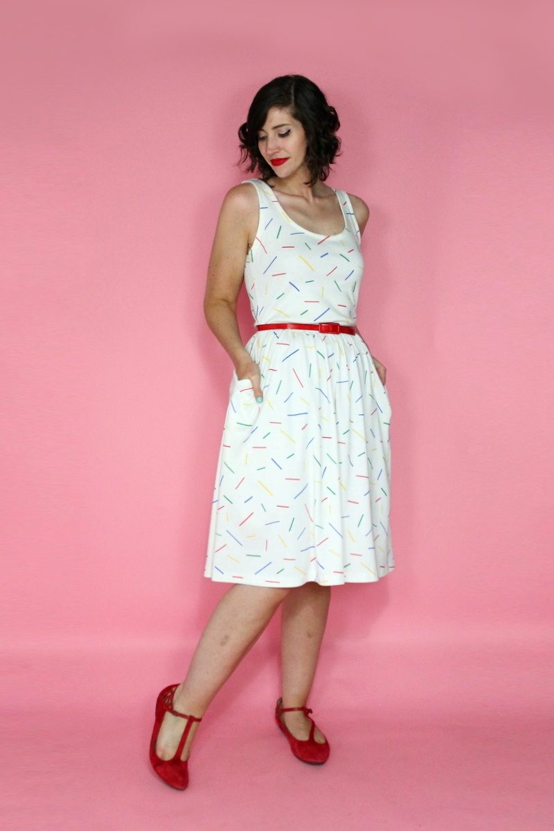 I’m always a sucker for a hit of nostalgia which is why I thrifted this colorful sprinkled dress last month. It reminded me of vintage dishware but for the purpose of this post, I dressed to resemble Fruit Stripe gum of yesteryear! Who else remembers that stuff?!