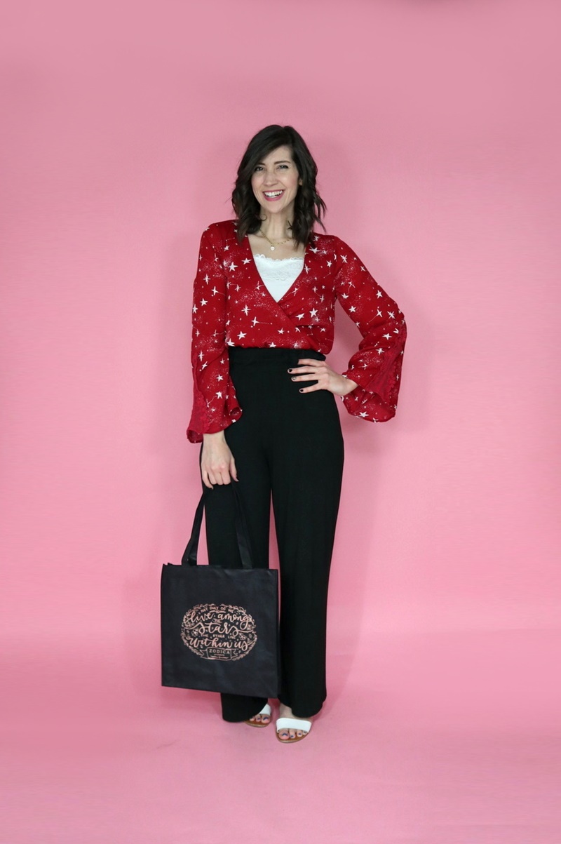 When I showed you this too-small star printed romper in my April thrift haul video, I already had a vision of how to transform it. Because I’m not big on sewing projects, I decided a simple solution was to cut off the romper below the elastic waistline to create an out-of-this-world blouse.
