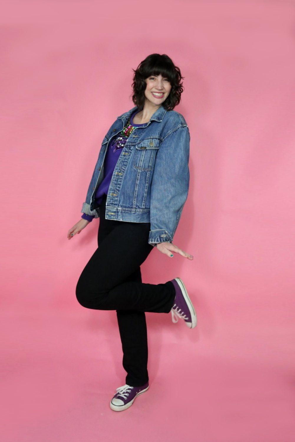 - An ugly sweater with… jeans and a denim jacket. You can barely see my sweater at all underneath my double denim which is what I was going for. It makes sequins seem daytime appropriate! I did add a fun element and wore purple Converse sneakers to pull a little bit of that color from the sweater.