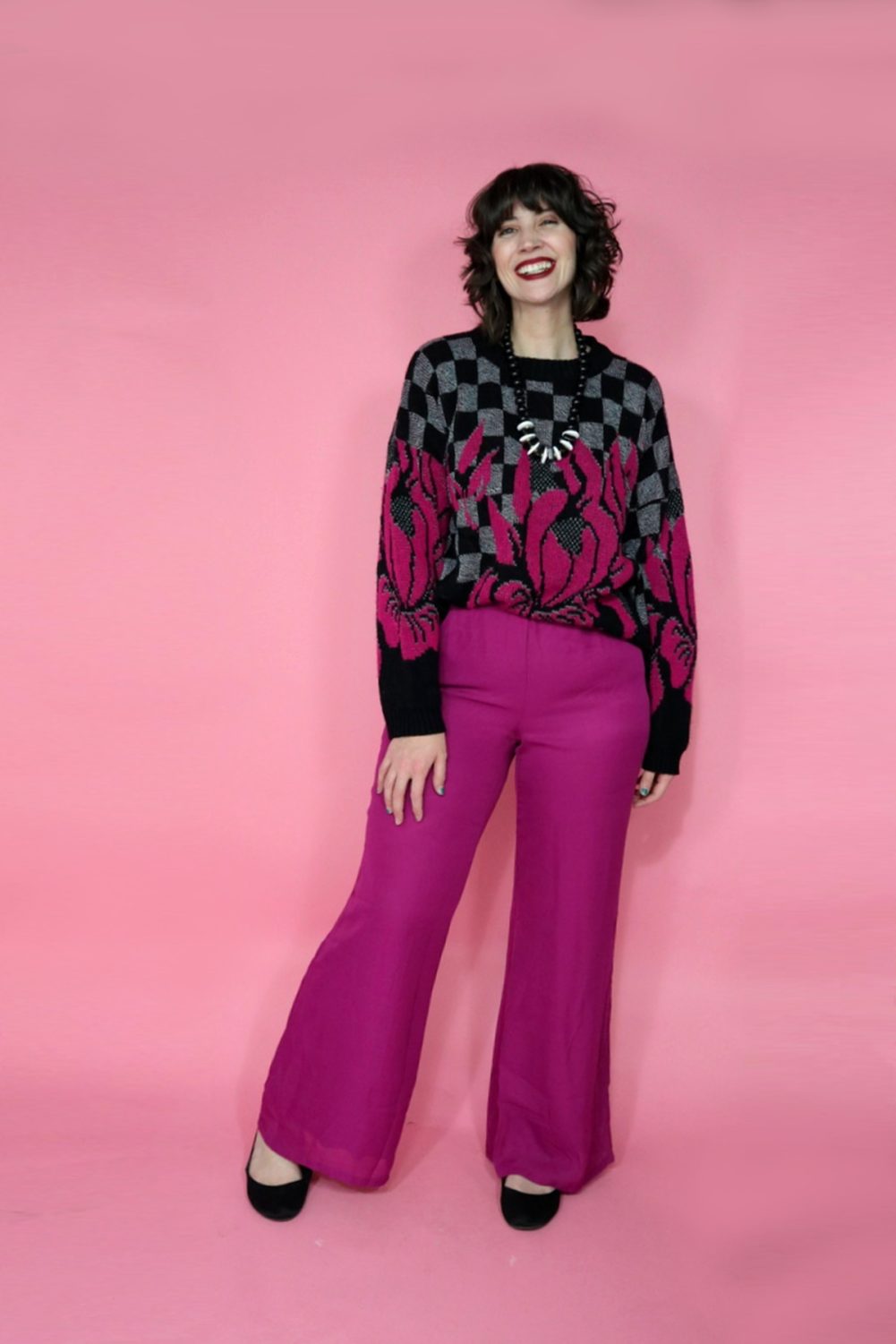 - An ugly sweater with… raspberry palazzo pants. If you really want some compliments, pair this sweater with pants in a matching color. I love a matchy-matchy moment!