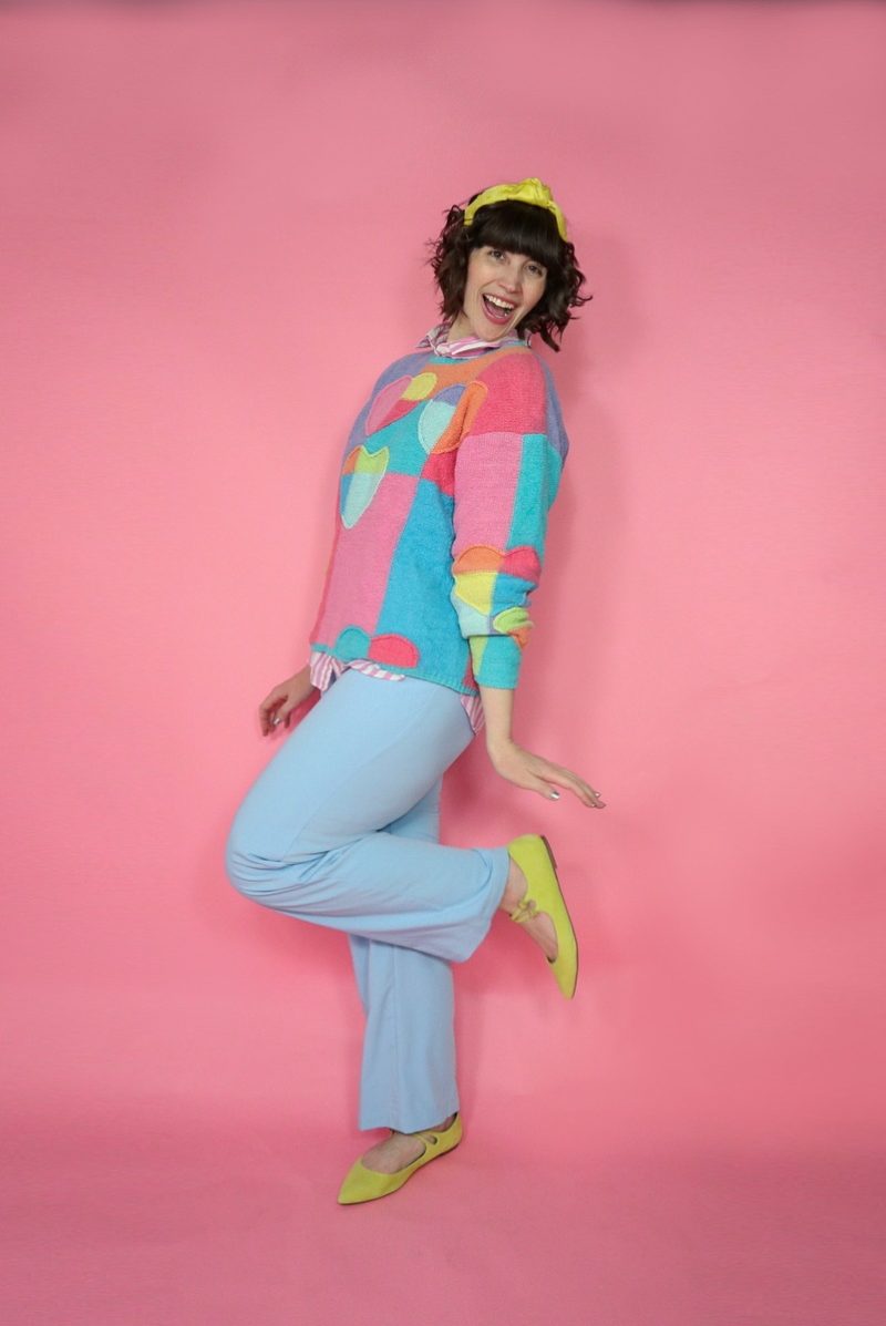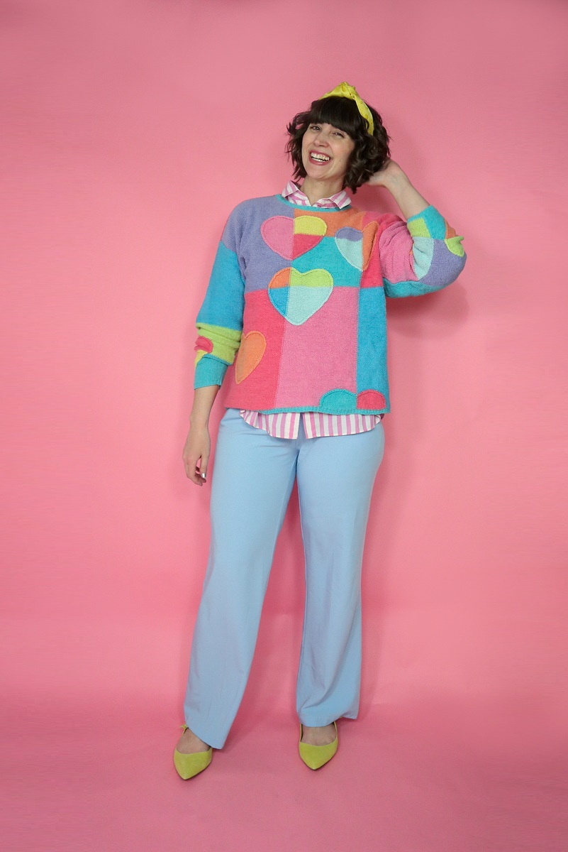 I normally reserve this heart printed sweater for Valentine’s Day and she was able to pair it with a striped button down, baby blue palazzo pants, and yellow flats to make it an outfit friendly for any cold weather day. I love it!