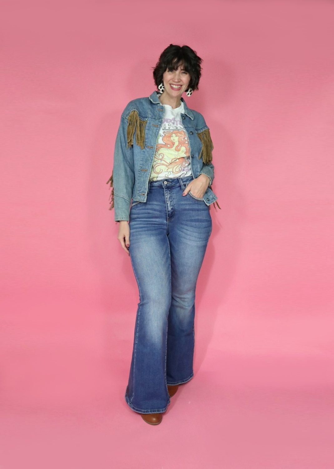 I gave in to the hippie vibes and wore the top combo with my biggest flared jeans. Some booties + homemade cow print earrings really topped it all off!