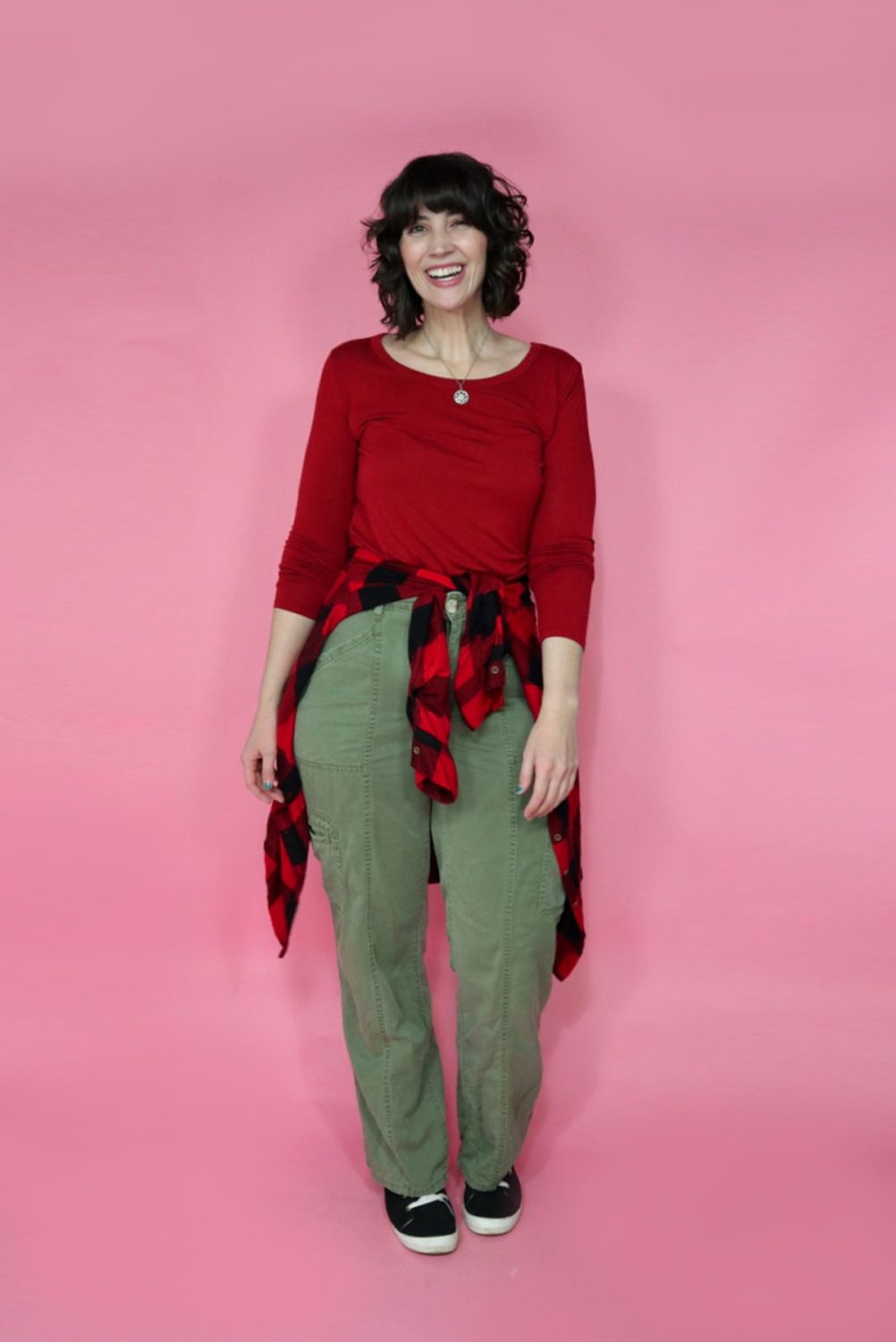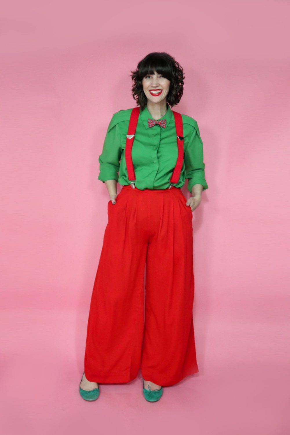 Pair a festive top with some cozy pants but keep the whole look in red & green Christmas colors. Remember: comfort and festive are not mutually exclusive!
