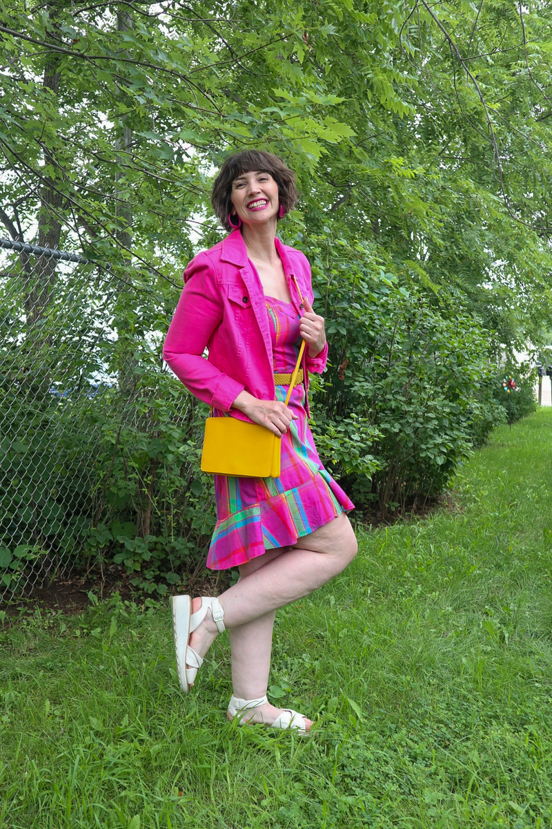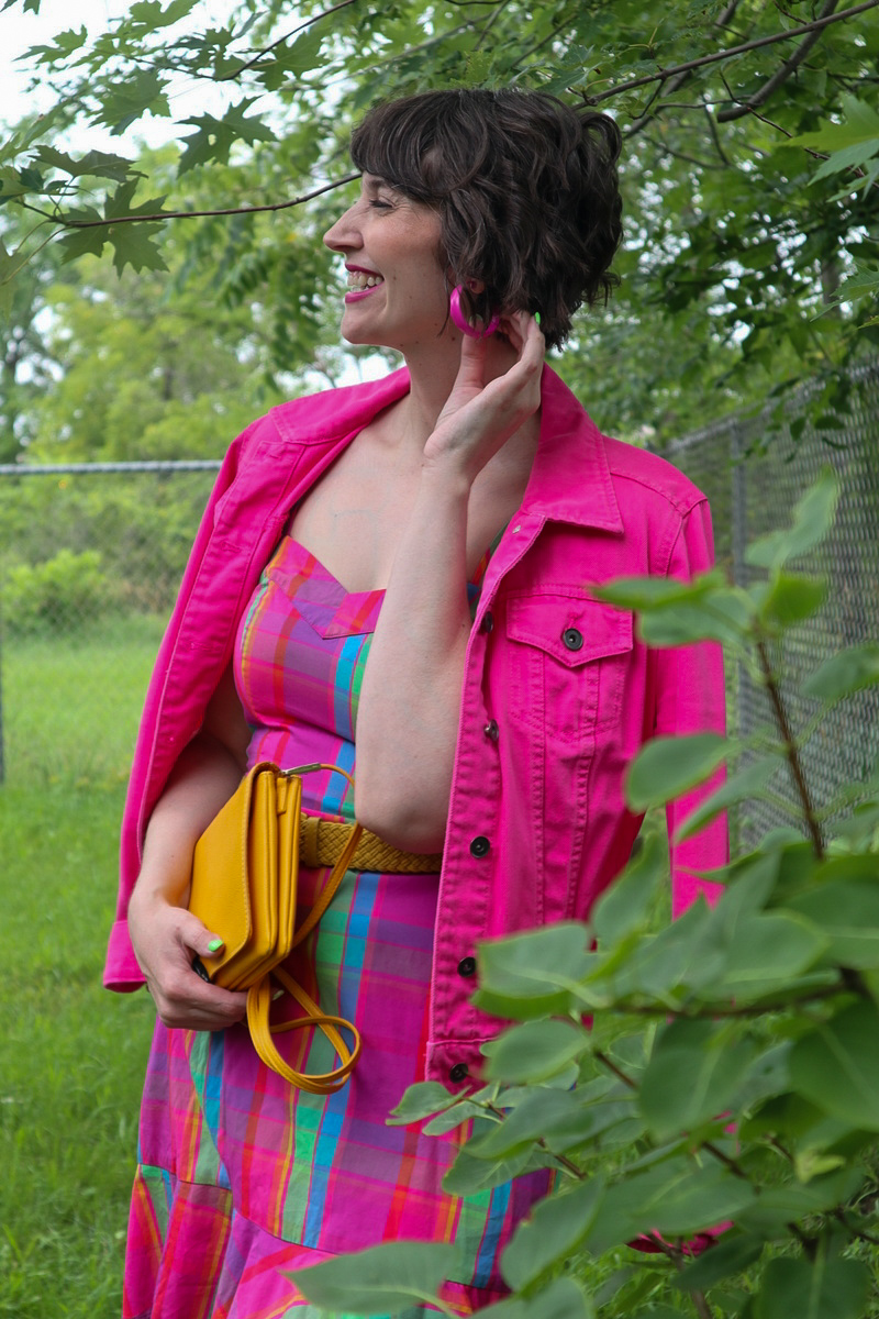 Another clothing swap item? This pink plaid dress! It’s delightfully whimsical with its sweetheart neckline and ruffled hem, so I paired it up with equally adorable extras—like a pink denim jacket, a thrifted yellow purse, and matchy-matchy pink hoop earrings.