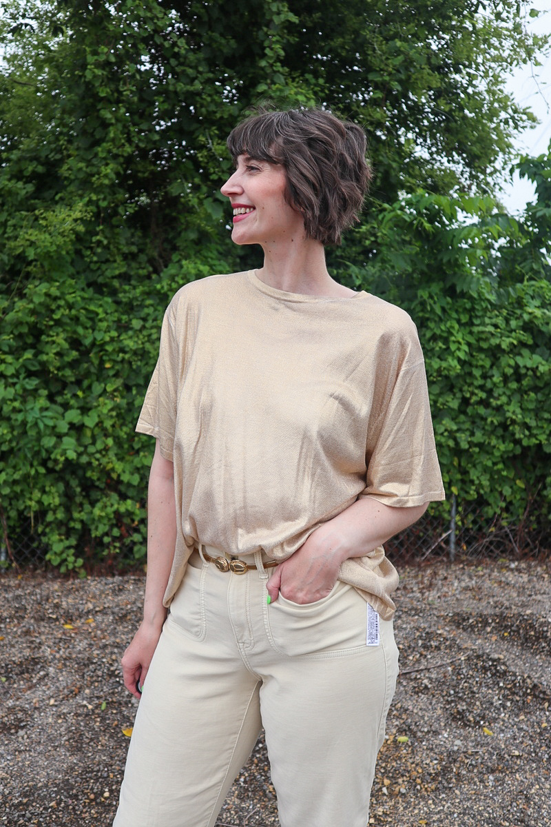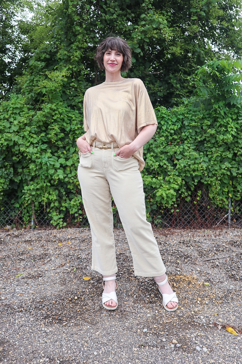 Who says beige has to be boring? As a rainbow-y outfit repeater, I challenged myself to style a neutral but make it fabulous. I think this ThredUp gold tee, off-white capris, and stellar vintage gold belt are anything but basic!