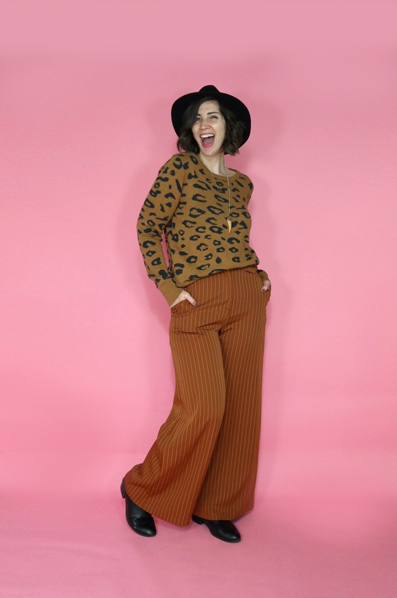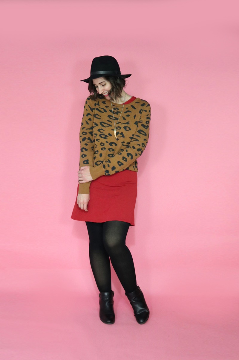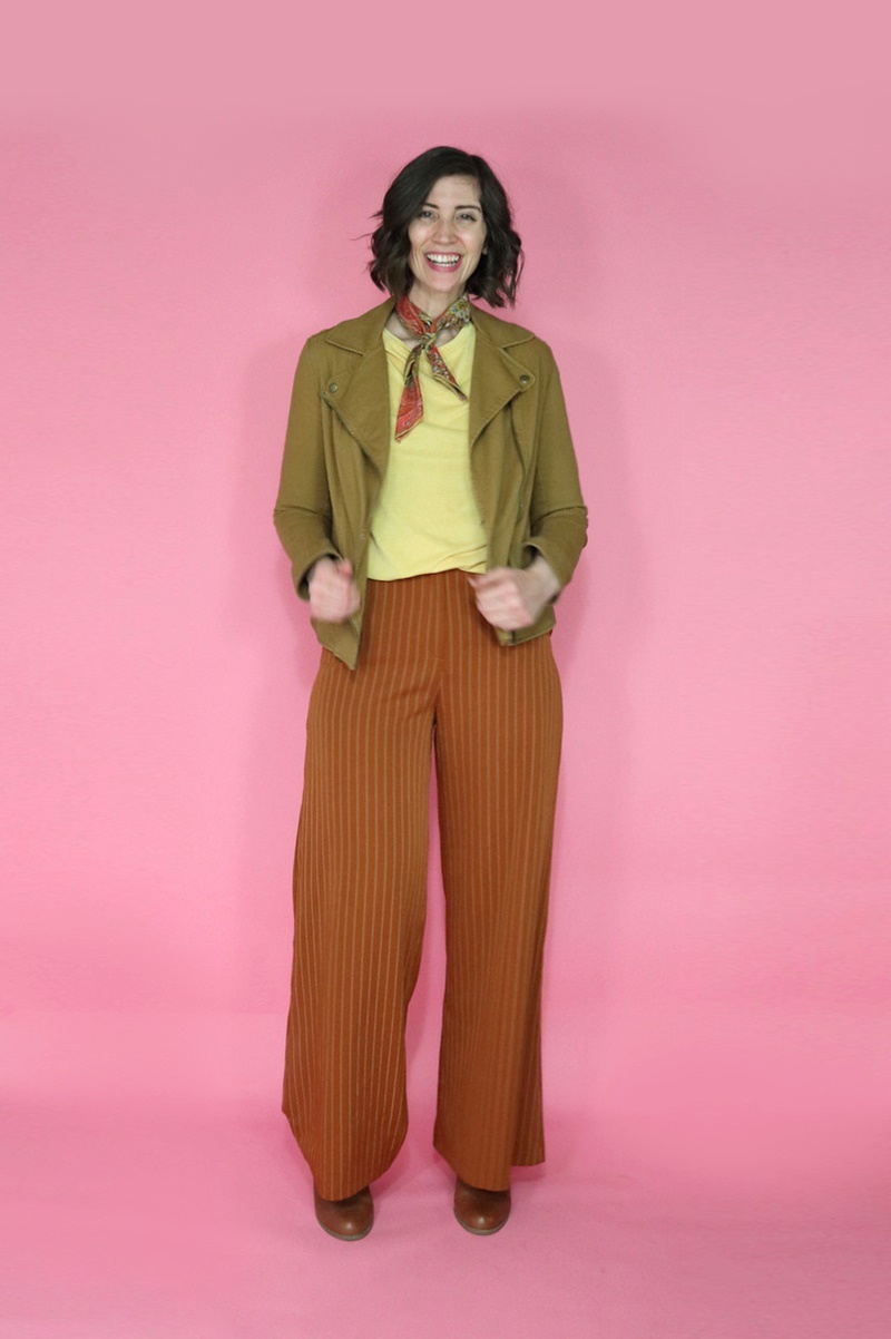 They are: little orange dress, orange tee, yellow tee, white turtleneck, leopard print pullover sweater, baby blue cardigan, cognac moto jacket, maroon jeggings, leopard print skirt, and burnt orange palazzo pants. (If I did it all over again, I’d swap out the orange tee for a graphic tee. I think it would have expressed my personal style a smidge better.)
