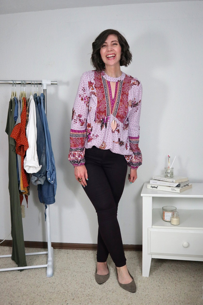 I was totally drawn to this brightly colored boho-style top with its bishop sleeves and keyhole neckline.