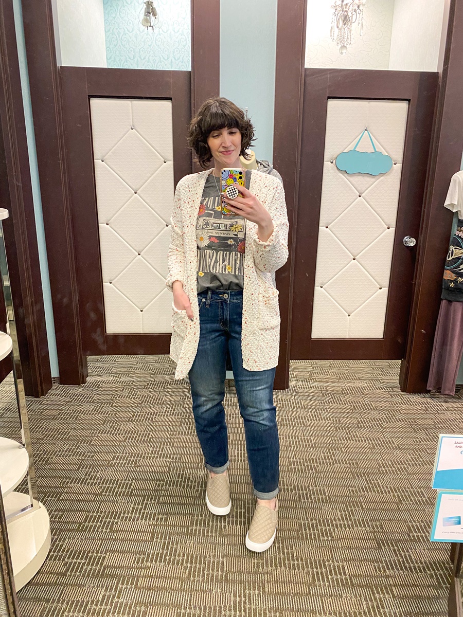 While sweaters gain popularity in the fall, they’re a staple all winter and spring here in Wisconsin! I love that you can add one to pretty much any outfit and change the entire look. How great does this pom pom cardigan look with a graphic tee and jeans? So effortless!