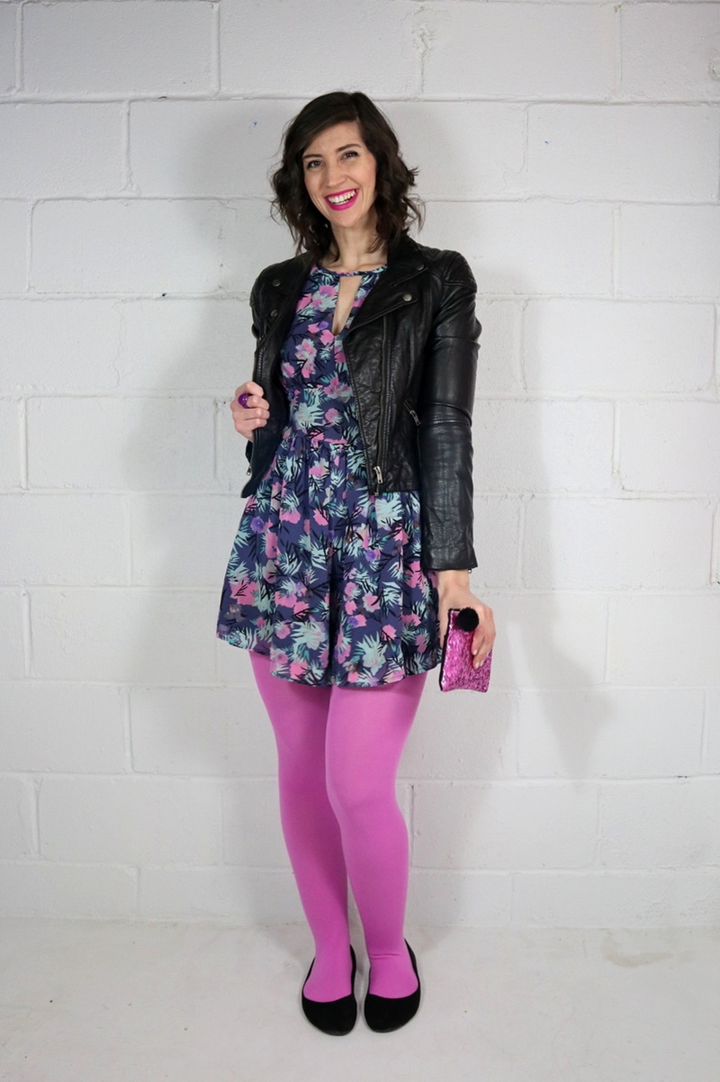 Turns out that pink tights and a moto jacket are a perfect match. Who knew? I love the juxtaposition of the feminine printed romper with a tough topper. This outfit is totally date night ready for anything!