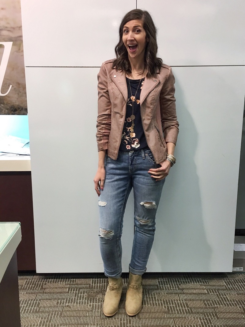 Maurices long sleeve tee | Maurices cardigan | Maurices navy blue jeggings | Maurices flats | Maurices moto jacket | Maurices/Silver Brand boyfriend jeans | Maurices booties